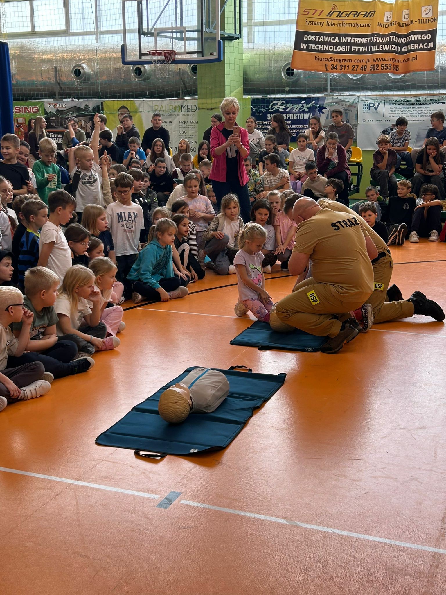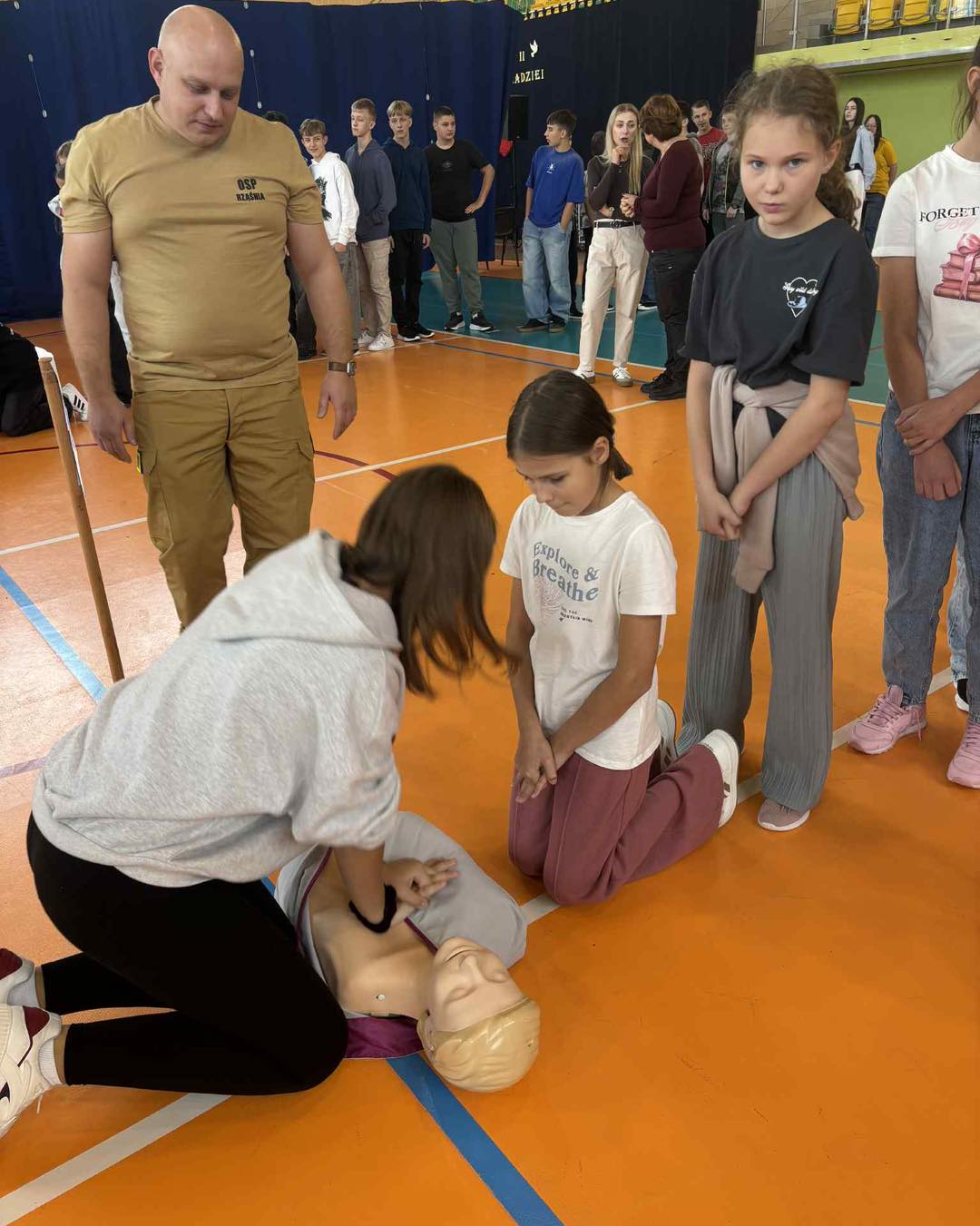 16 października to Europejski Dzień Przywracania Czynności Serca – globalna inicjatywa, której celem jest zwiększenie świadomości znaczenia ratowania życia poprzez prowadzenie resuscytacji krążeniowo – oddechowej przez osoby postronne, np. świadków zdarzenia. Z tej okazji Zespół Szkolno – Przedszkolny im. Jana Pawła II w Rząśni zaprosił do siebie strażaków ochotników z Ochotniczej Straży Pożarnej w Rząśni, którzy przeprowadzili pokaz resuscytacji oraz uczestniczyli w indywidualnych ćwiczeniach uczniów ratujących życie. Uczestnicy prowadzili resuscytację na fantomach, ćwicząc właściwe tempo i technikę ucisków.