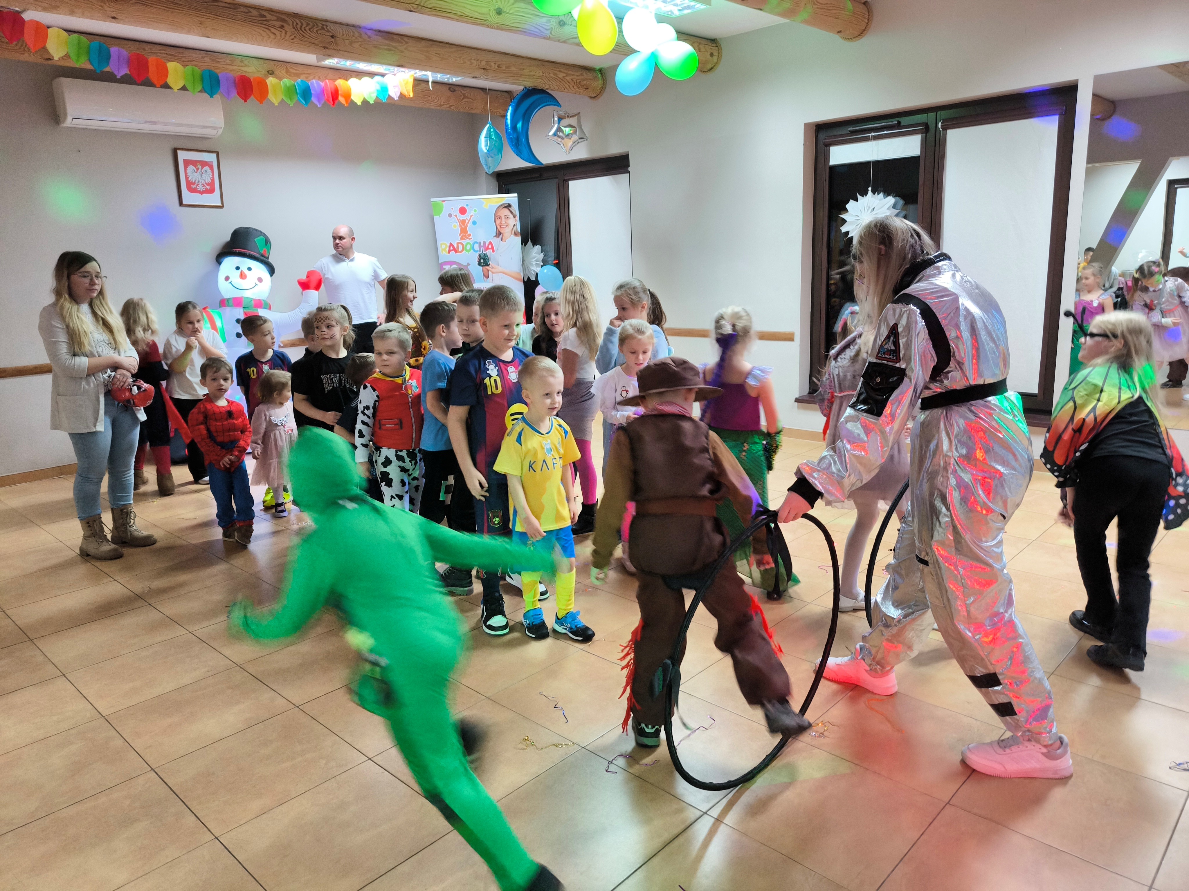 Nie zabrakło również pokazu strojów i przebrań podczas którego każde dziecko mogło zaprezentować swój kostium i otrzymać gromkie brawa. W przerwie czekał na wszystkich słodki poczęstunek – ciasto, babeczki, napoje, oraz cukierki od Wójta które dodały energii do dalszej zabawy. Na zakończenie dzieci otrzymały pamiątkowe dyplomy i drobne upominki. W sali unosiła się atmosfera radości.