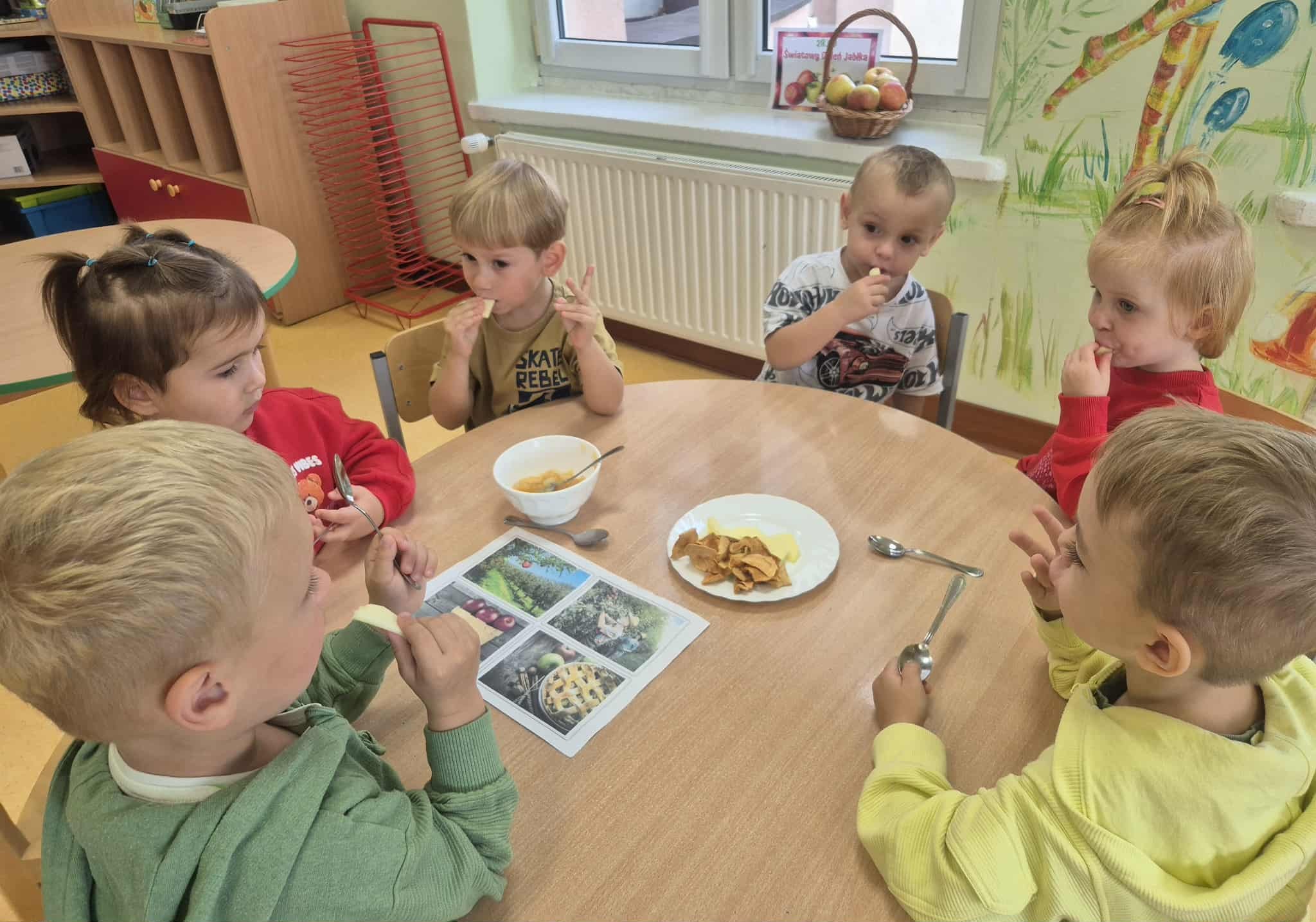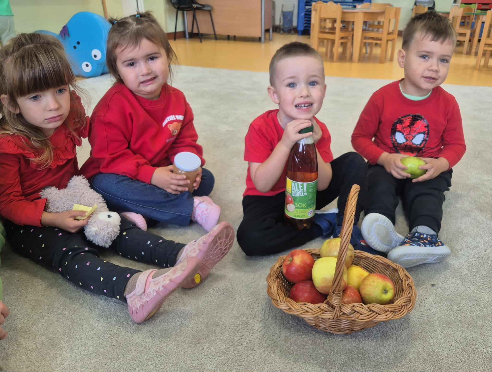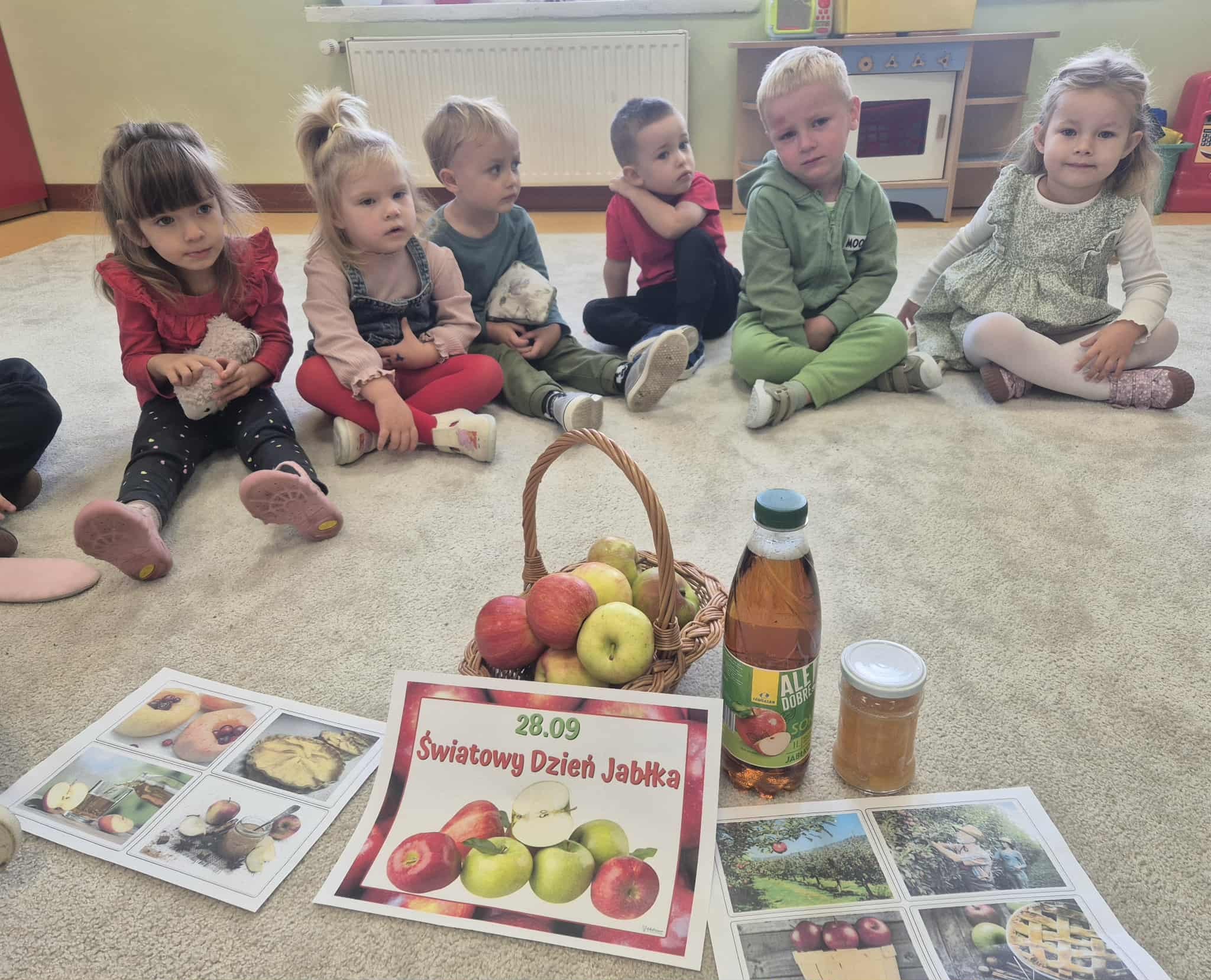 Dzieci wszechstronnie poszerzały wiedzę o tym owocu, jego walorach, smakach. Poznawały różne gatunki jabłek, rozpoznawały kształt, zapach, kolor, smak. Zdobywały wiadomości na temat potraw i przetworów z jabłek. Smakowaliśmy jabłek oraz ich przetworów- suszonych jabłek, soku, kompotu, racuchów oraz szarlotki.