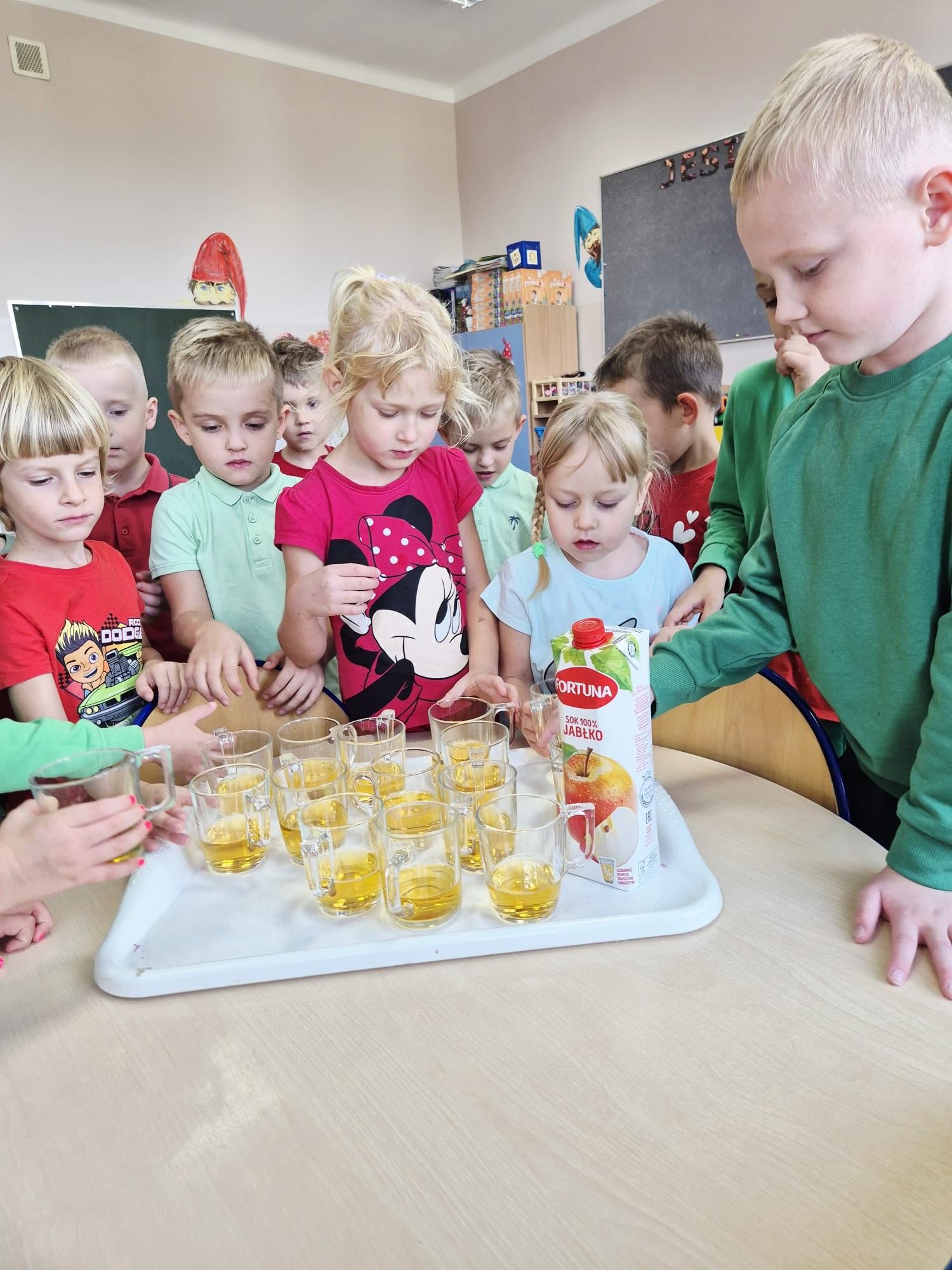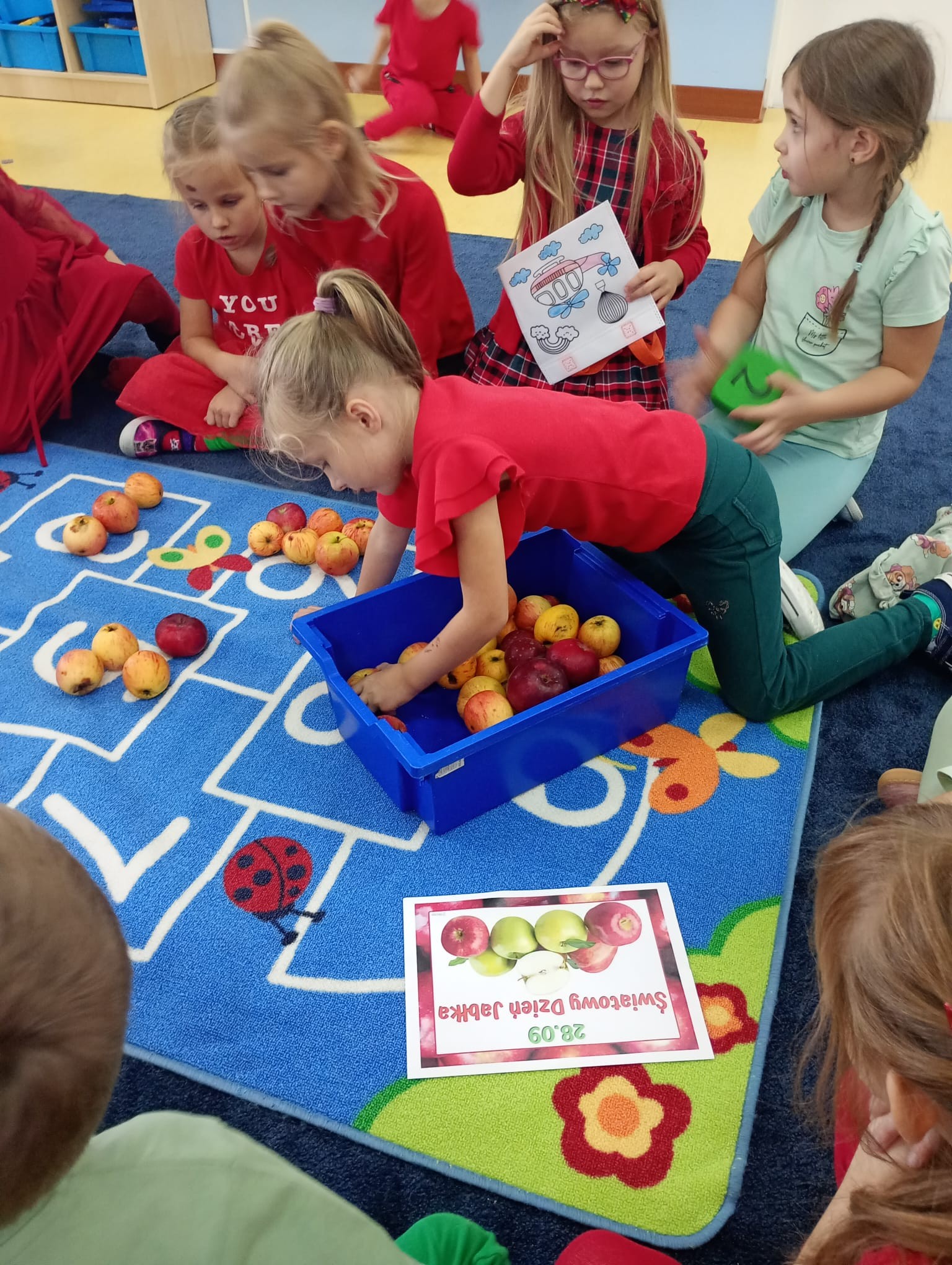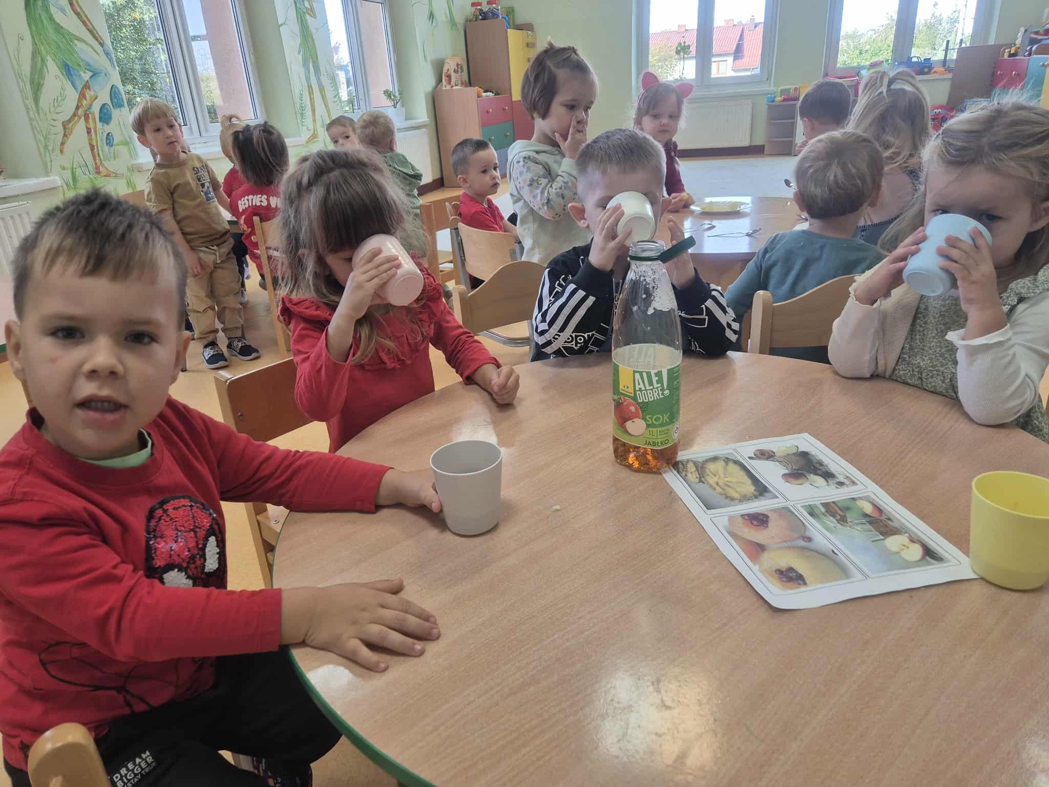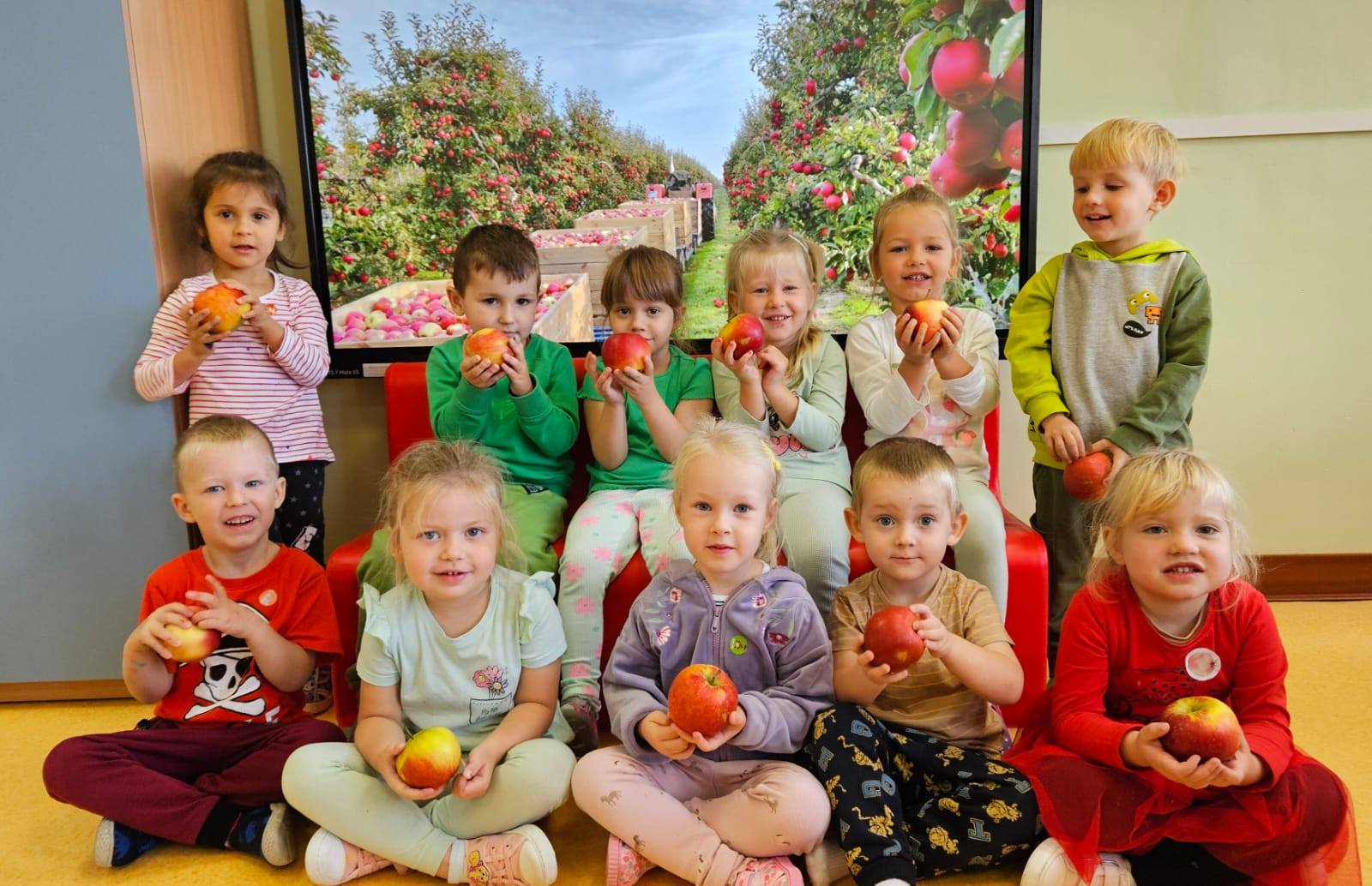 Dzieci wszechstronnie poszerzały wiedzę o tym owocu, jego walorach, smakach. Poznawały różne gatunki jabłek, rozpoznawały kształt, zapach, kolor, smak. Zdobywały wiadomości na temat potraw i przetworów z jabłek. Smakowaliśmy jabłek oraz ich przetworów- suszonych jabłek, soku, kompotu, racuchów oraz szarlotki.