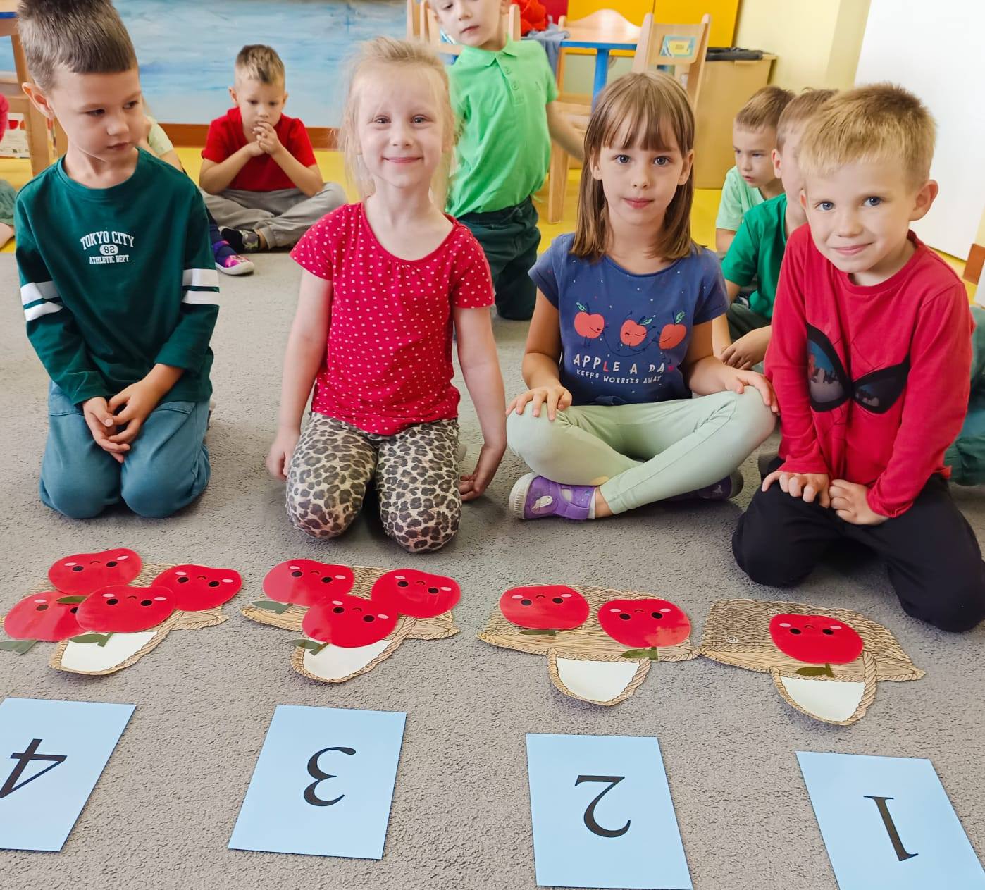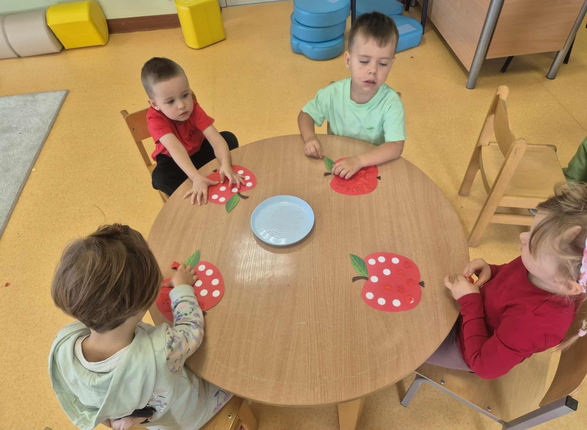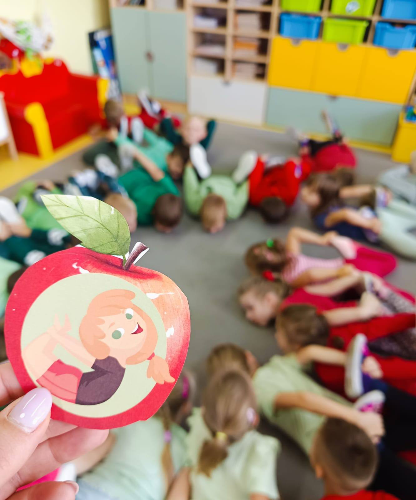 Jabłko w tym dniu królowało podczas zabaw ruchowych, dydaktyczny, matematycznych i plastycznych. Oto ono i my.