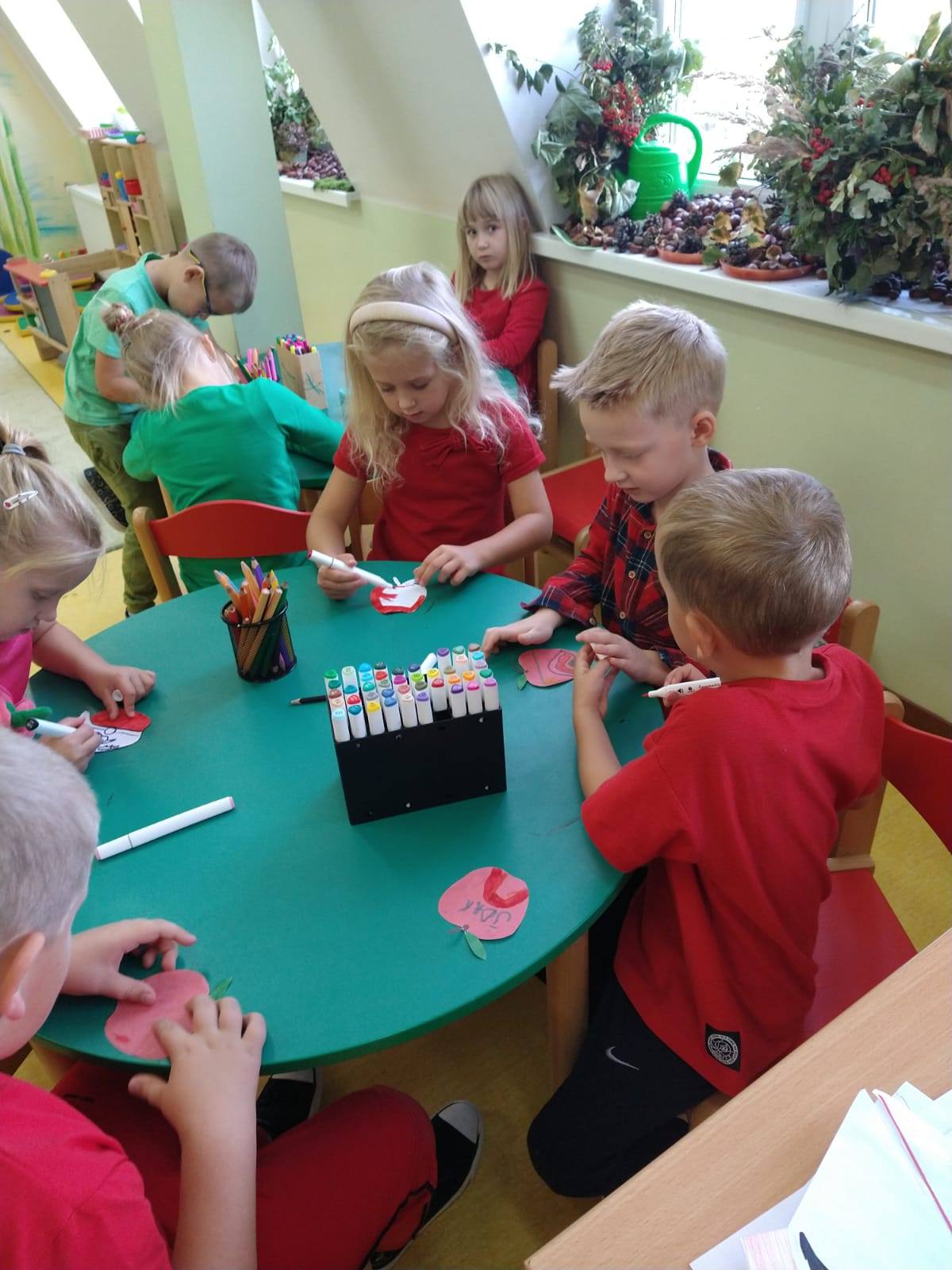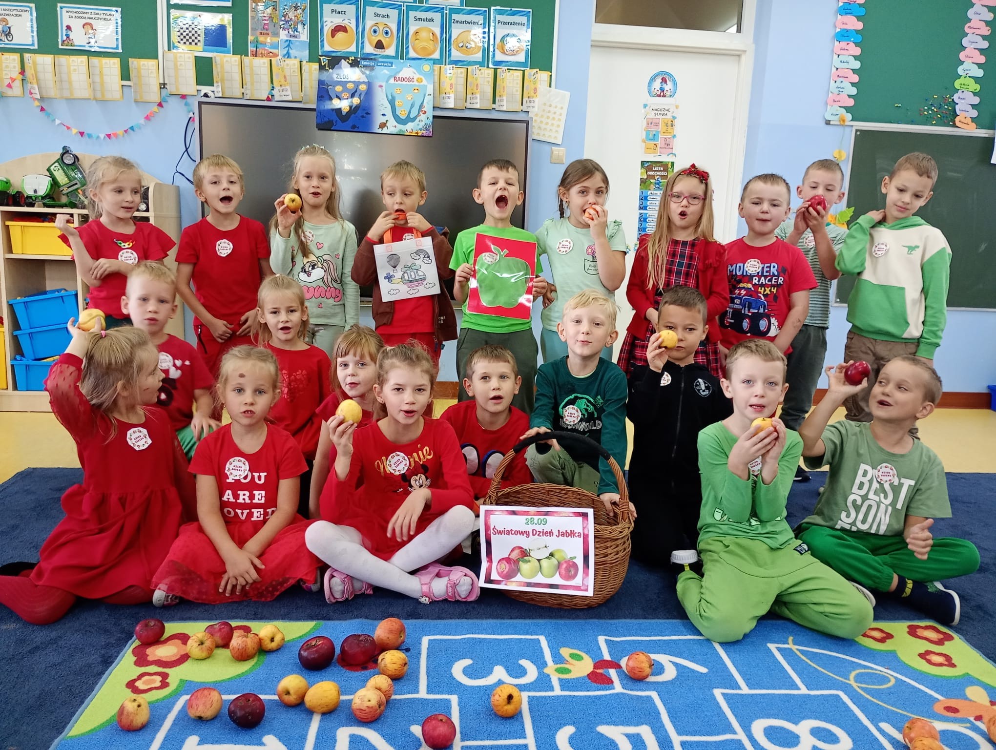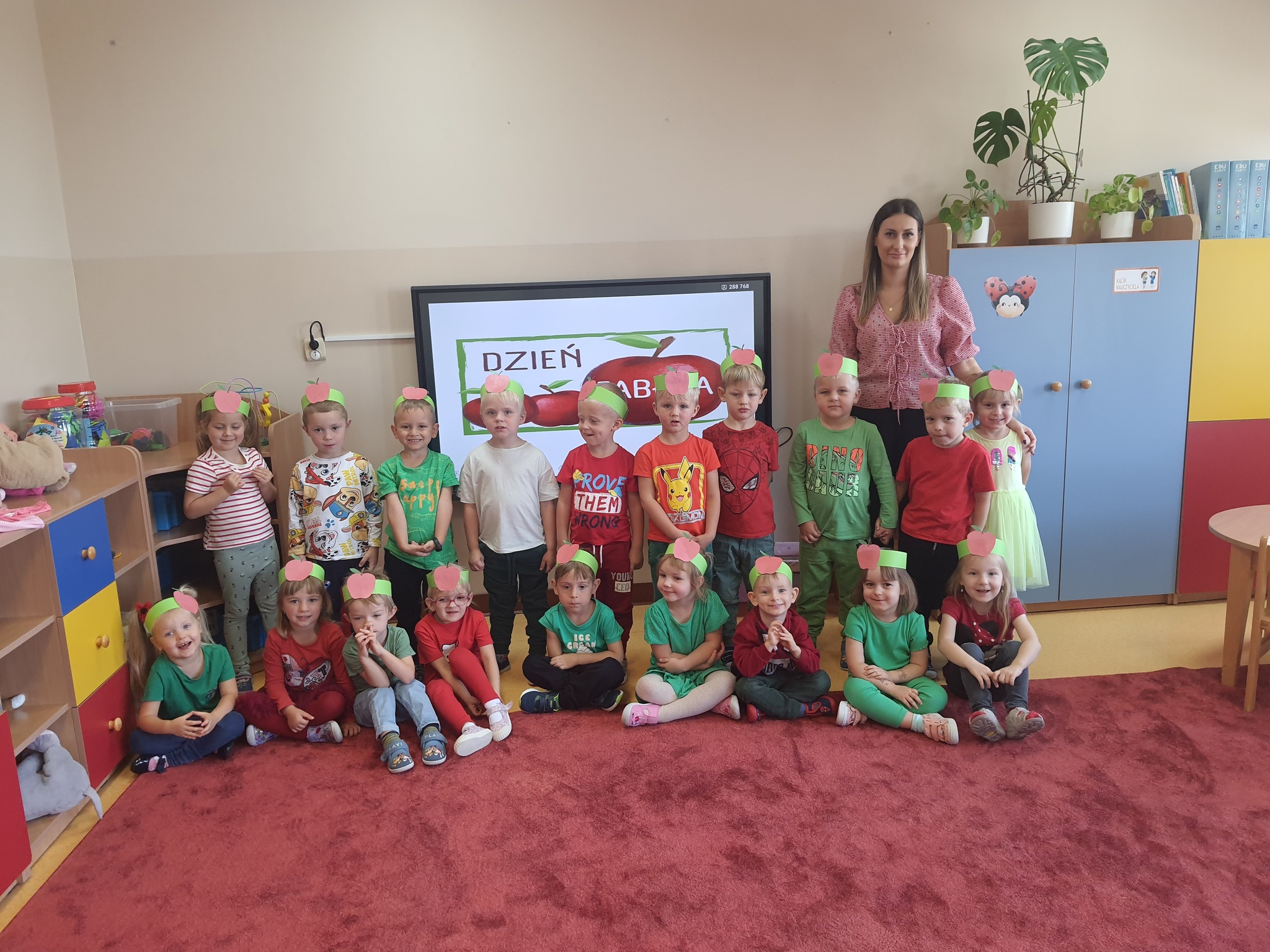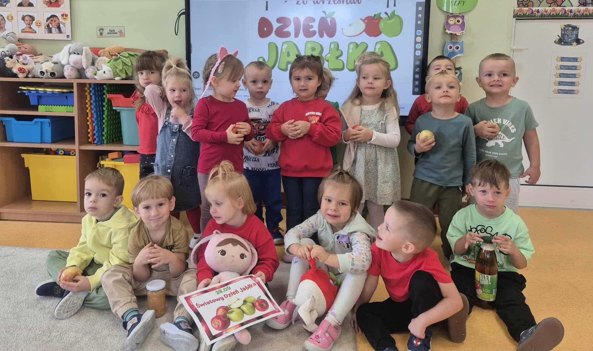 Soczyste, pyszne i zdrowe oto one jabłko w naszej przedszkolnej odsłonie. W piątek obchodziliśmy Dzień Jabłka – dlatego w naszym przedszkolu królował kolor czerwonych i zielonych jabłek.