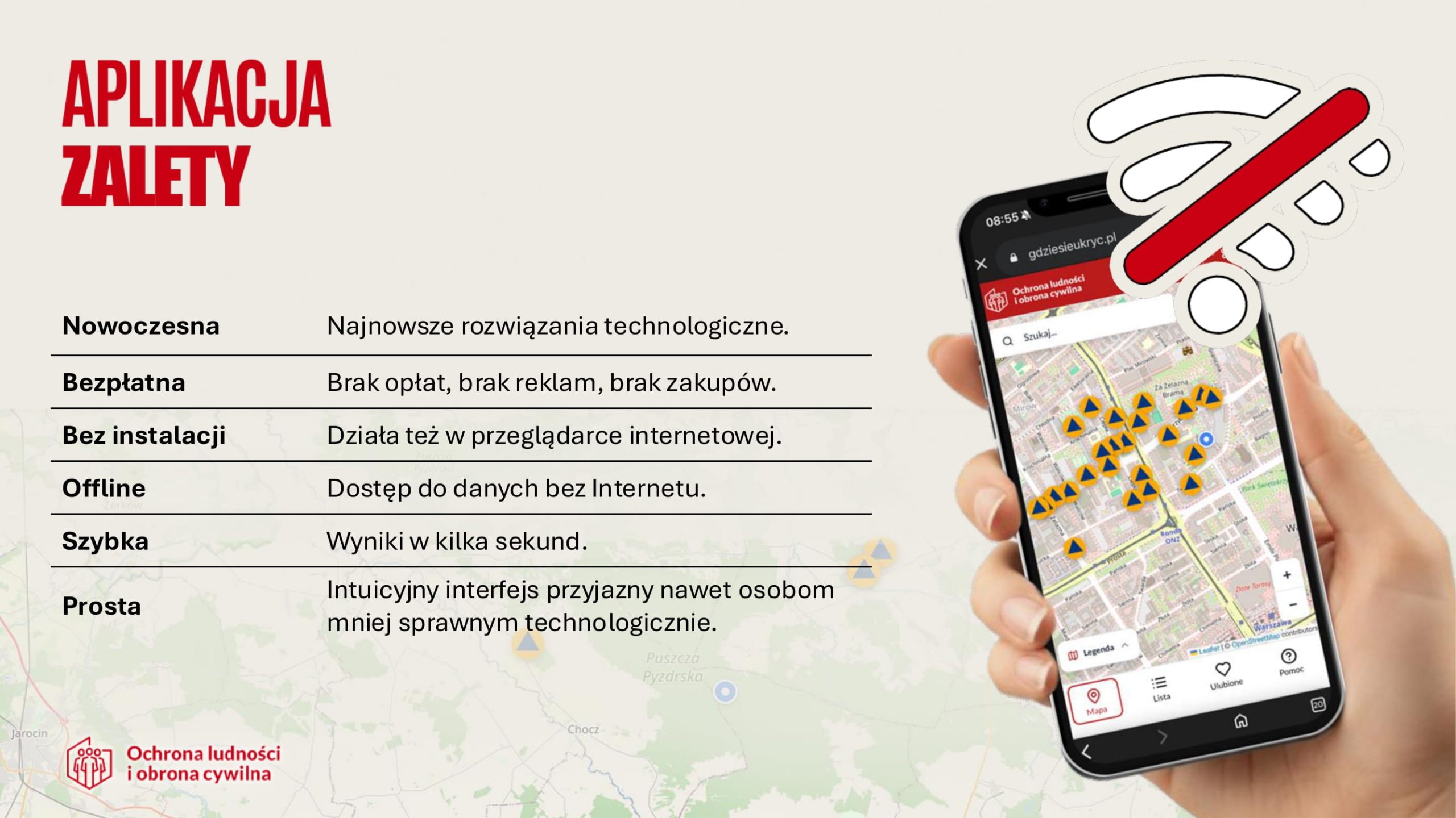 „Gdzie się ukryć” to nowoczesne i przyjazne narzędzie, które może posiadać każdy obywatel. Zostało zaprojektowana z myślą o prostocie i skuteczności: wystarczy telefon komórkowy typu smartfon by w sytuacji nagłego zagrożenia – np. bardzo silnego wiatru czy potencjalnych zagrożenie środkami napadu powietrznego – szybko odnaleźć najbliższe Punkty Schronienia (PS) oraz uruchomić nawigację na mapie. Co ważne, po wcześniejszym pobraniu danych aplikacja działa również w trybie offline