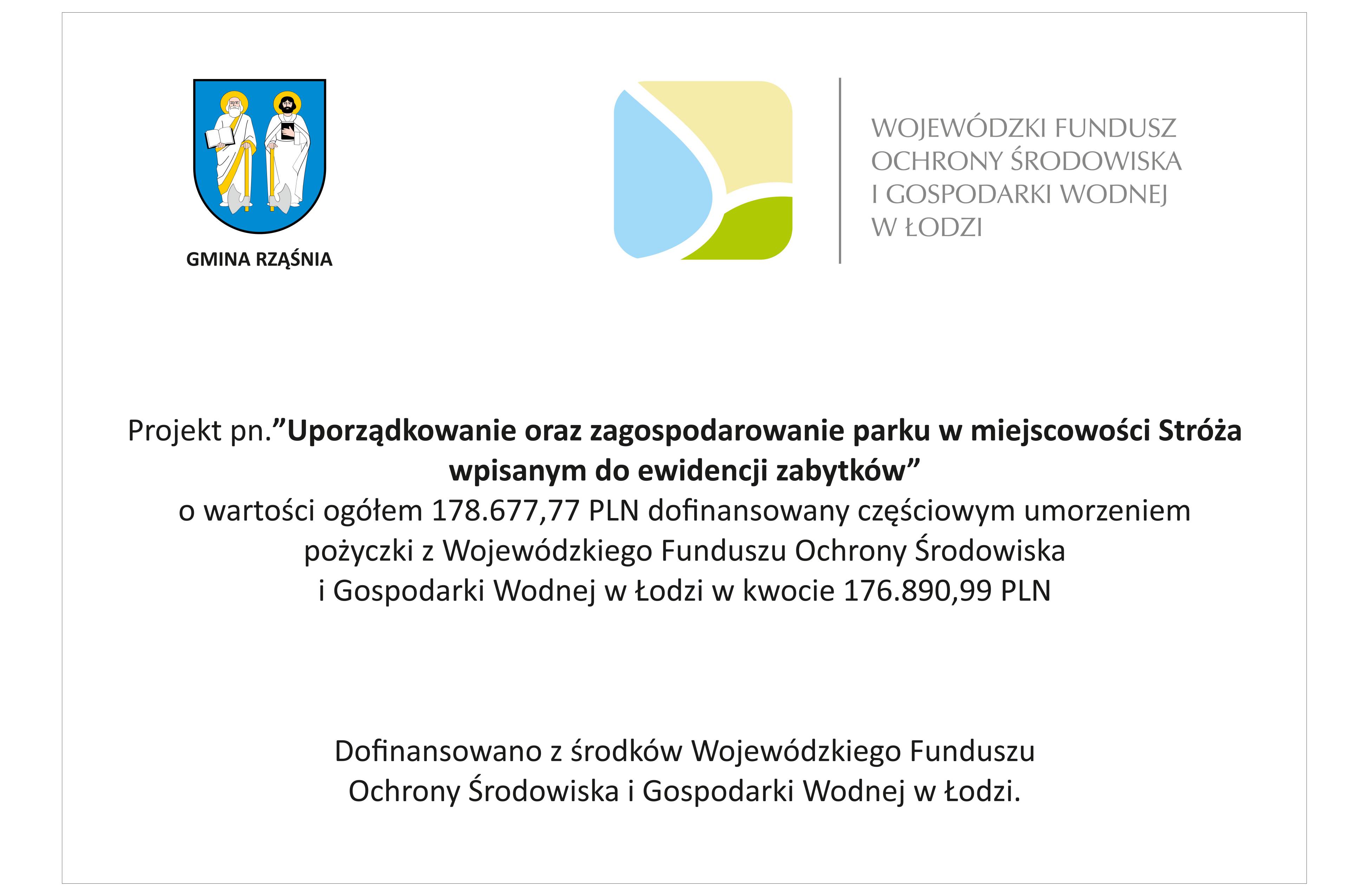 4. „Uporządkowanie oraz zagospodarowanie parku w miejscowości Stróża wpisanego do ewidencji zabytków” w ramach tego zadania dokonano cięć pielęgnacyjnych istniejącego drzewostanu w parku oraz wykonano montaż wiązań na kilkunastu drzewach w parku po za tymi pracami dokonano nasadzeń nowych drzew liściastych i iglastych, nasadzono nowe krzewy wykonano ściółkowanie korą i zrębkami pod nowo posadzonymi roślinami/drzewami, zamontowano również system nawodnienia, który pozwoli na łatwiejsze przyjęcie się nowo posadzonych roślin. Wartość zrealizowanego projektu to 182.126,00 zł. wsparcie WFOŚiGW w Łodzi wyniosło 176.890,99 zł. brutto.
