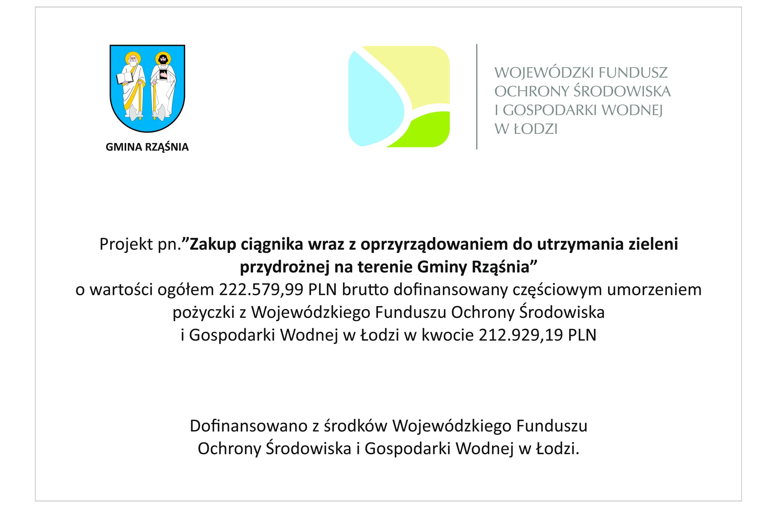 3. „Zakup ciągnika wraz z oprzyrządowaniem do utrzymania zieleni przydrożnej na terenie gminy Rząśnia” w ramach tego zadania zakupiono mały ciągnik rolniczy, kosiarkę bijakową, kosiarkę rotacyjną, kosiarkę jezdną oraz pług do odśnieżania i chodników. Wartość zrealizowanego projektu to 239.279,99 zł. wsparcie WFOŚiGW w Łodzi wyniosło 212.929,19 zł. brutto