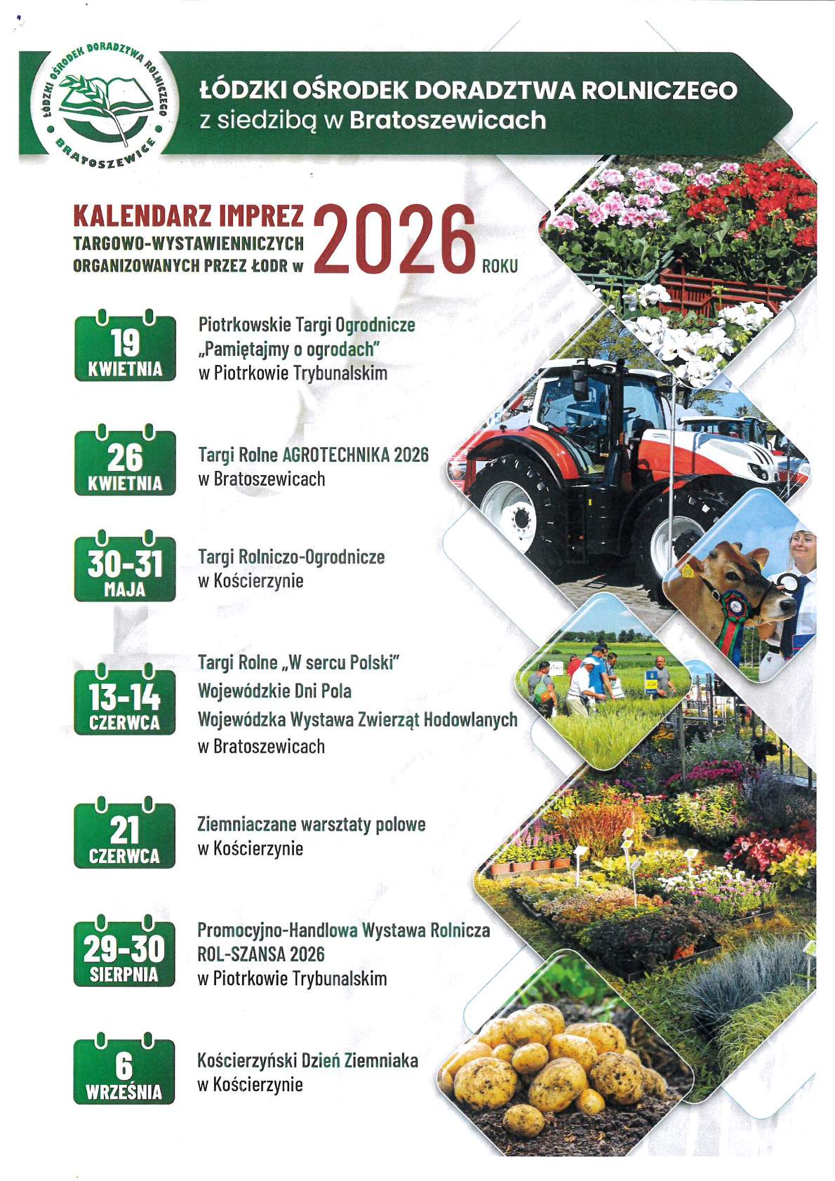 Na prośbę Łódzkiego Ośrodka Doradztwa Rolniczego z siedzibą w Bratoszewicach, Oddział w Kościerzynie – Powiatowy Zespół Doradztwa Rolniczego w Pajęcznie udostępniamy informację dotyczącą organizowanych imprez targowo-wystawienniczych organizowanych przez ŁODR w 2026 roku.