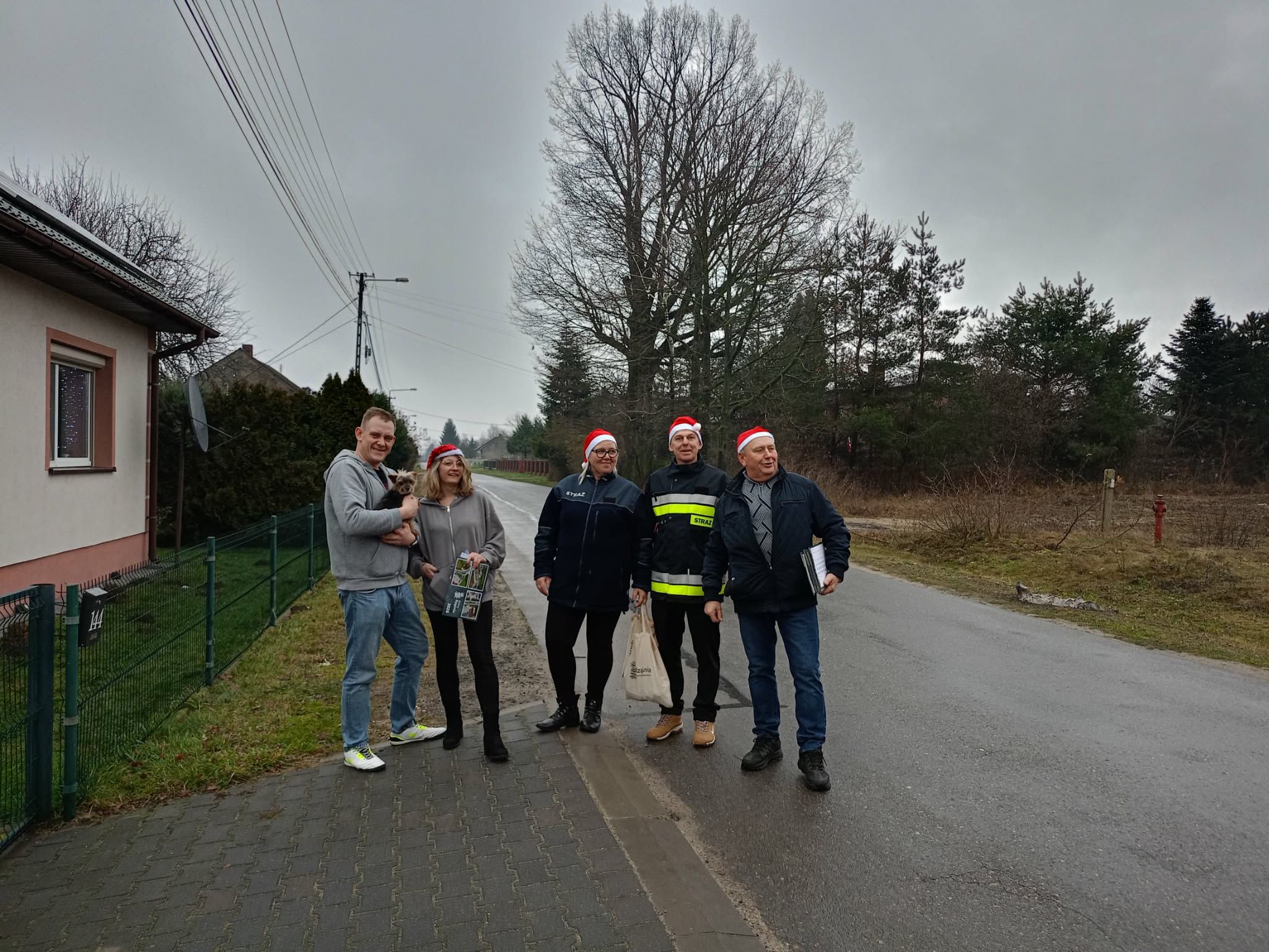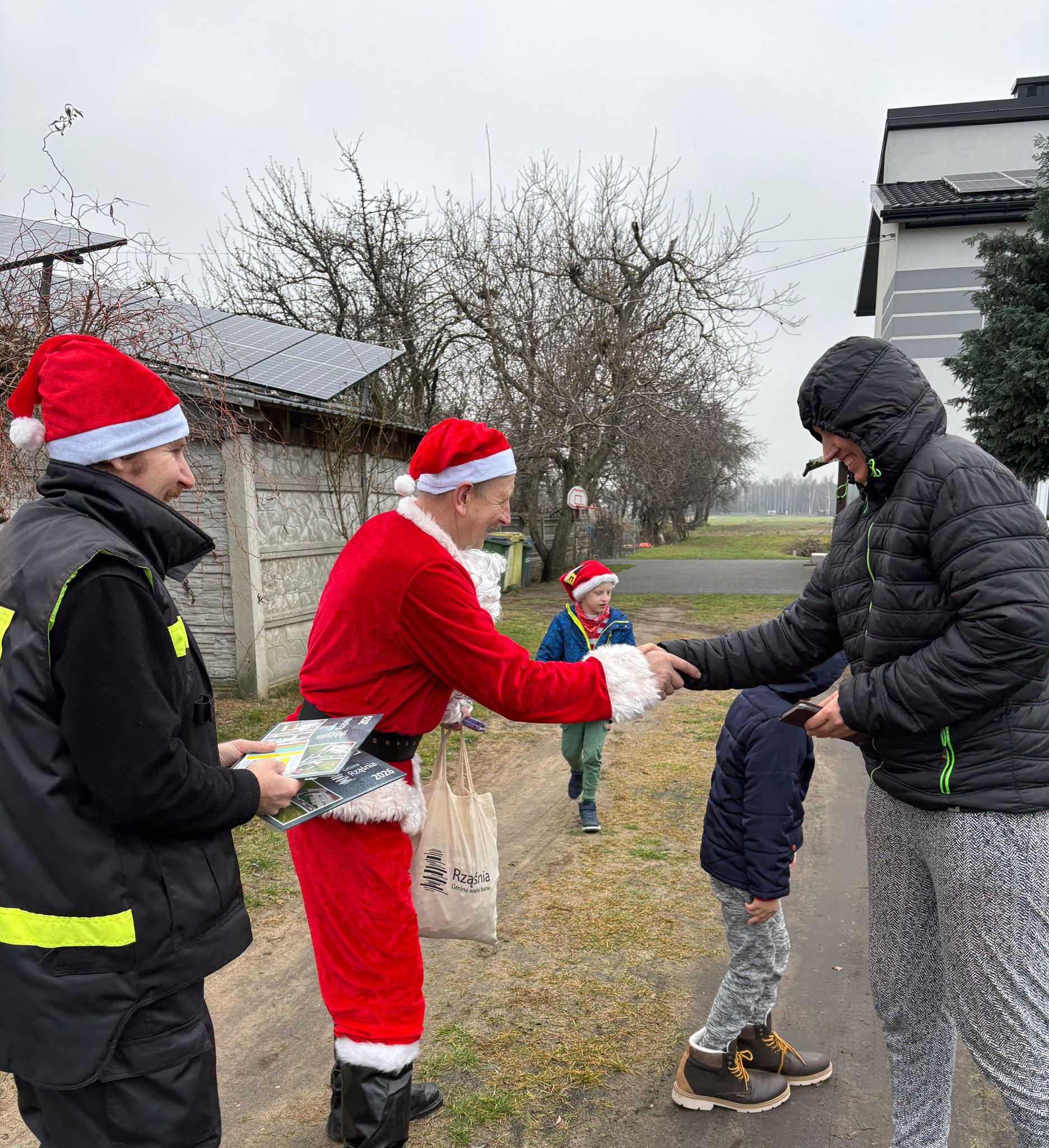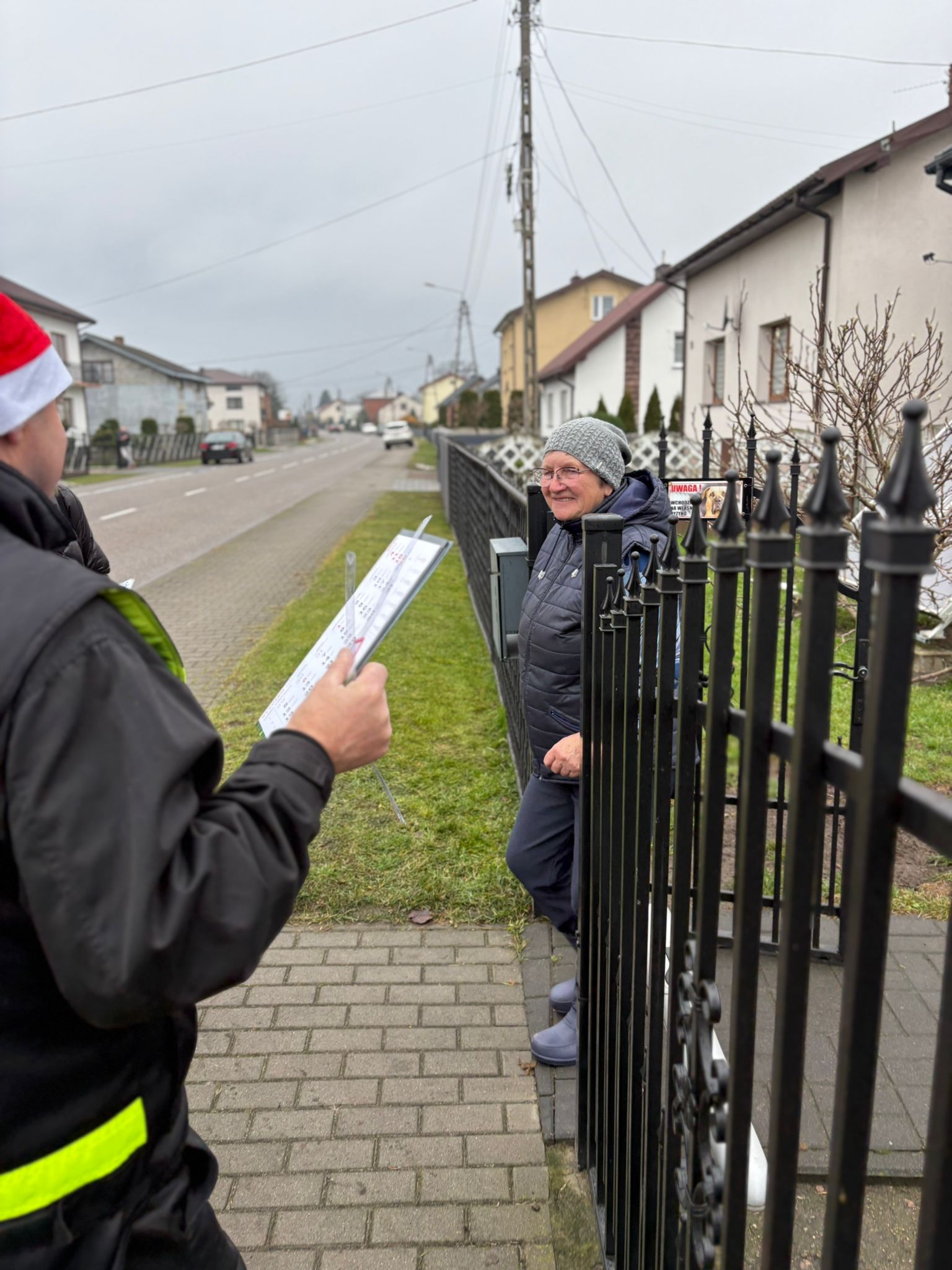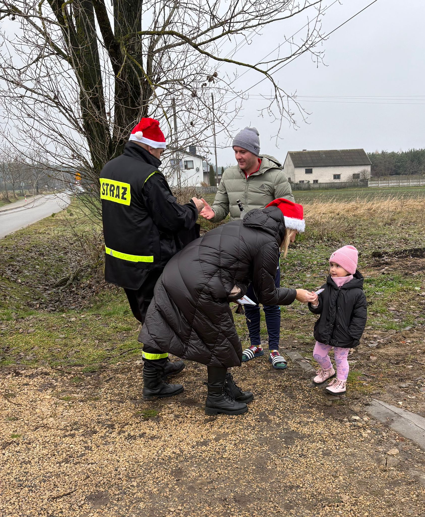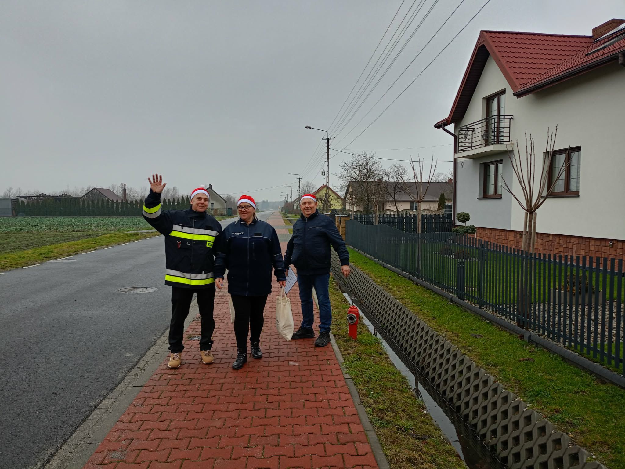 Strażacy – Mikołaje odwiedzali zarówno najmłodszych, jak i dorosłych mieszkańców, wręczając słodycze oraz gminne kalendarze na 2026 rok jako świąteczny upominek. Na twarzach napotkanych osób widzieliśmy mnóstwo uśmiechów, a ciepłe reakcje mieszkańców były najlepszym dowodem na to, że takie inicjatywy są potrzebne i budują naszą lokalną wspólnotę.