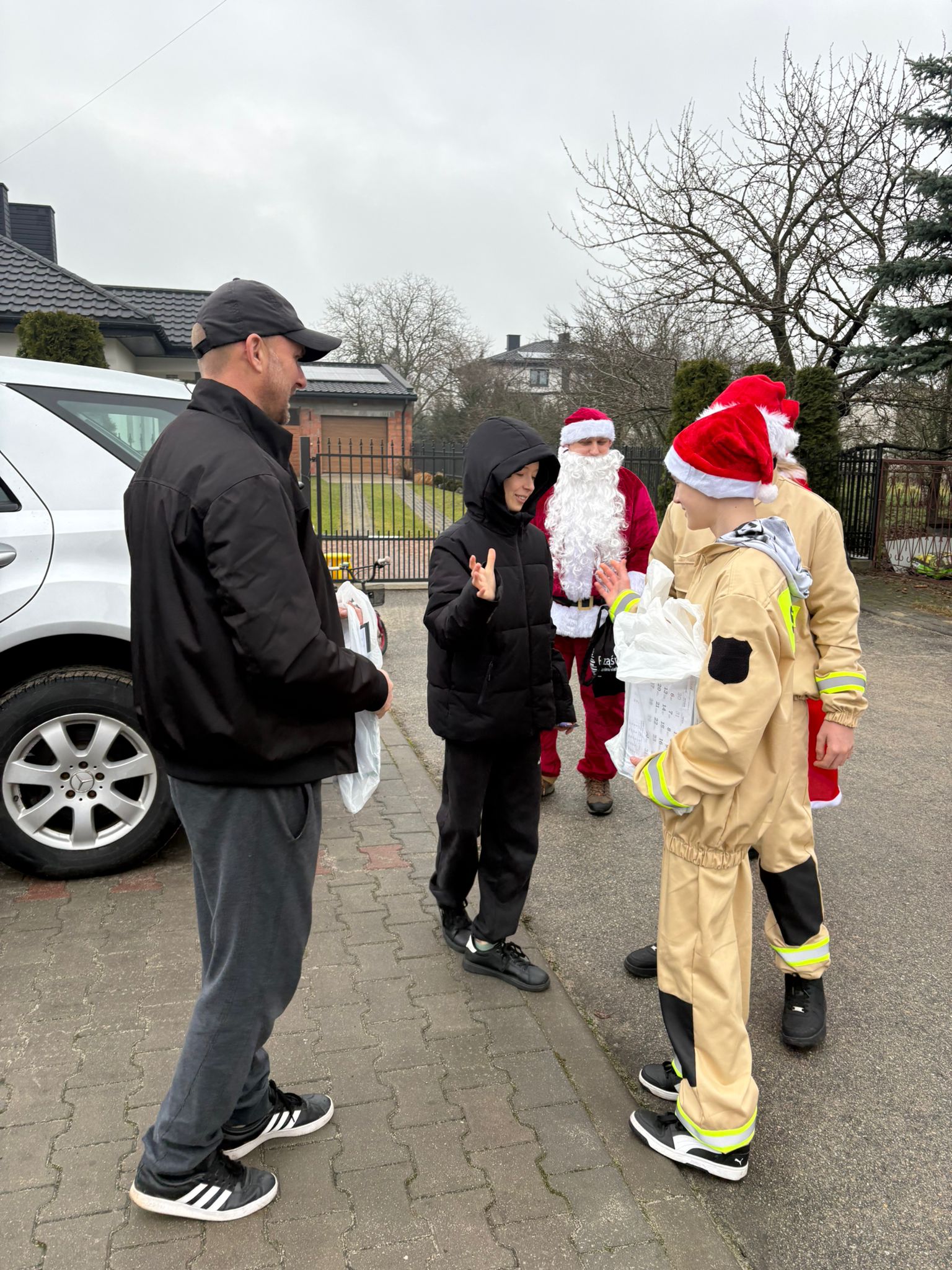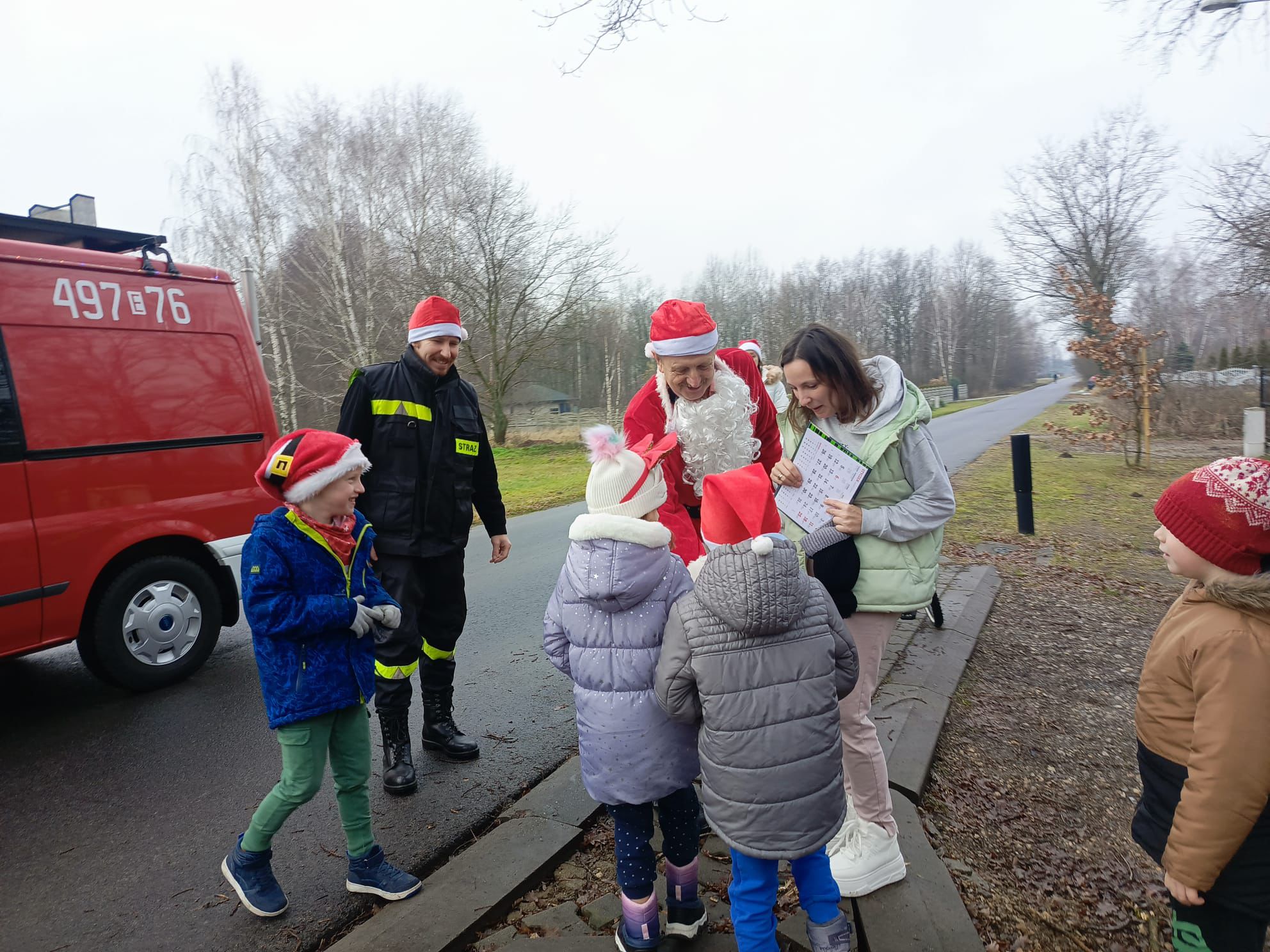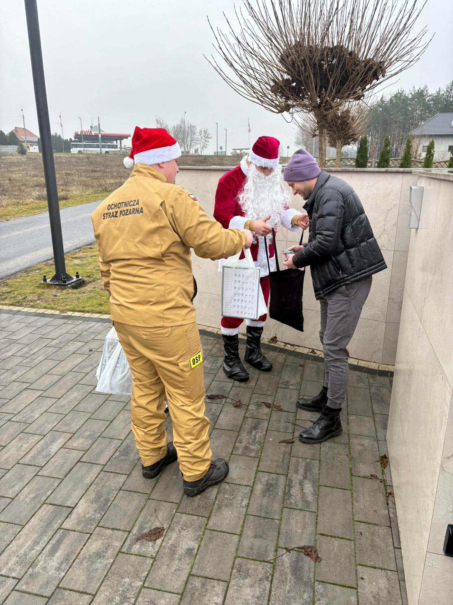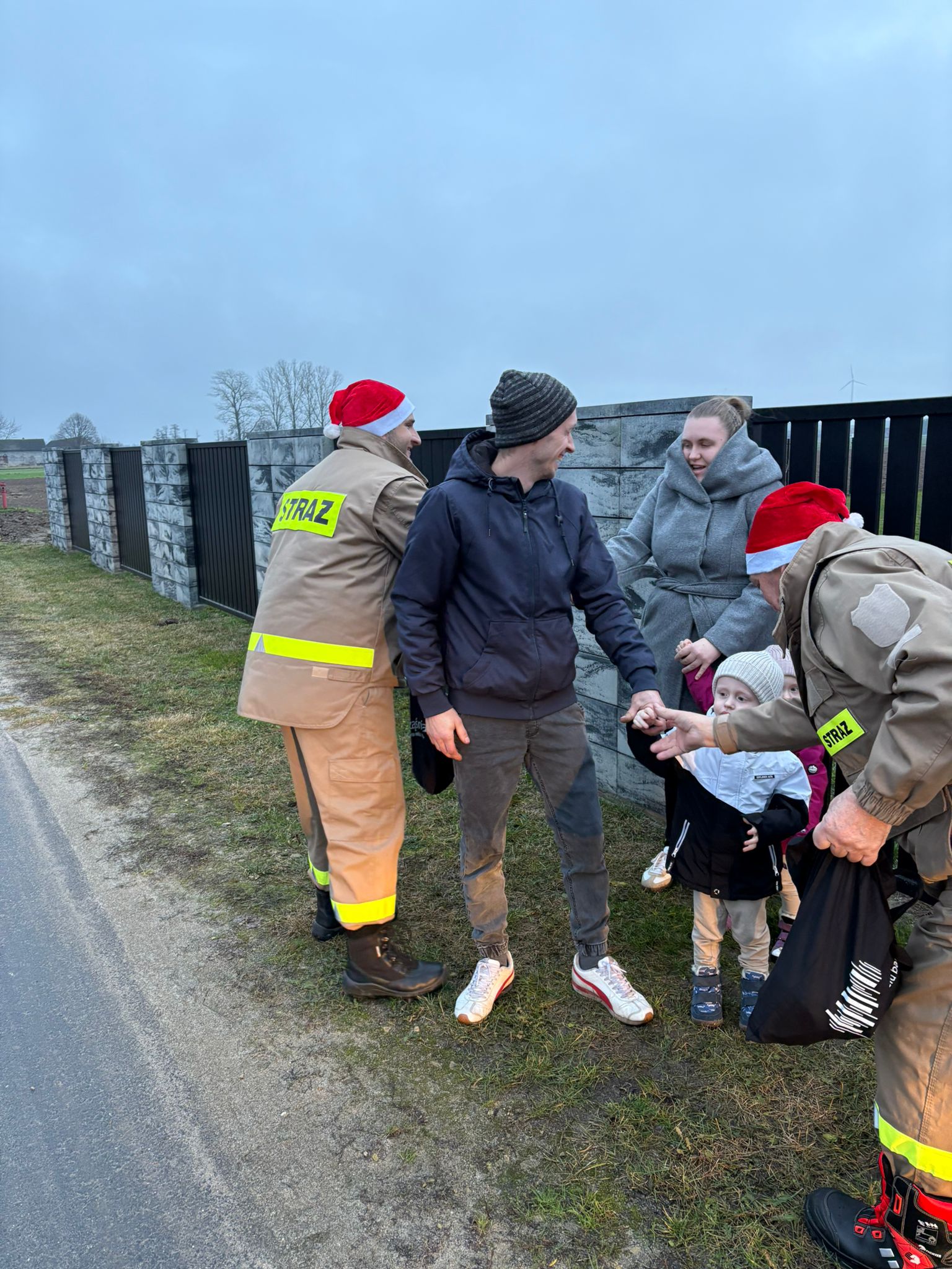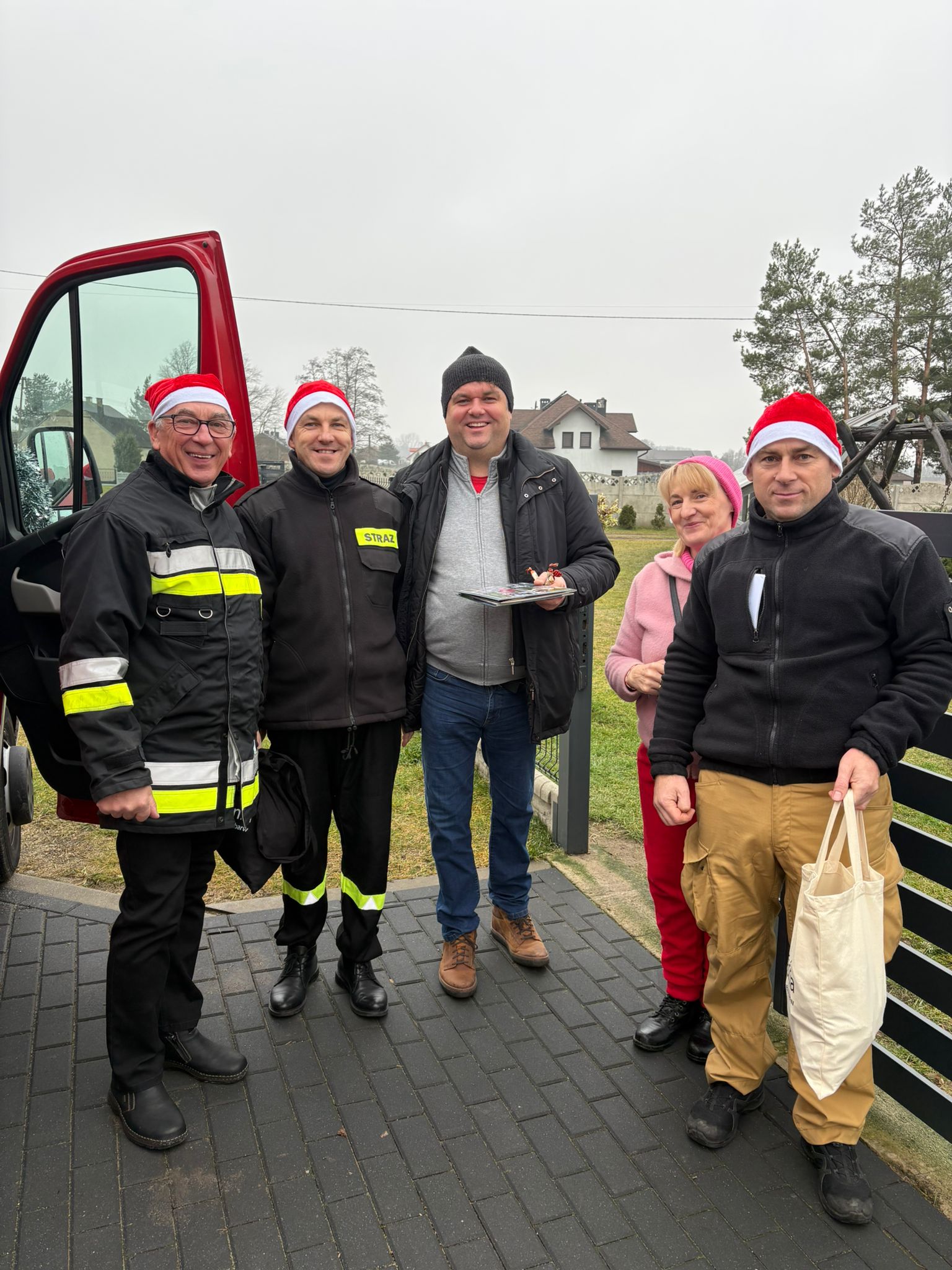 Strażacy – Mikołaje odwiedzali zarówno najmłodszych, jak i dorosłych mieszkańców, wręczając słodycze oraz gminne kalendarze na 2026 rok jako świąteczny upominek. Na twarzach napotkanych osób widzieliśmy mnóstwo uśmiechów, a ciepłe reakcje mieszkańców były najlepszym dowodem na to, że takie inicjatywy są potrzebne i budują naszą lokalną wspólnotę.