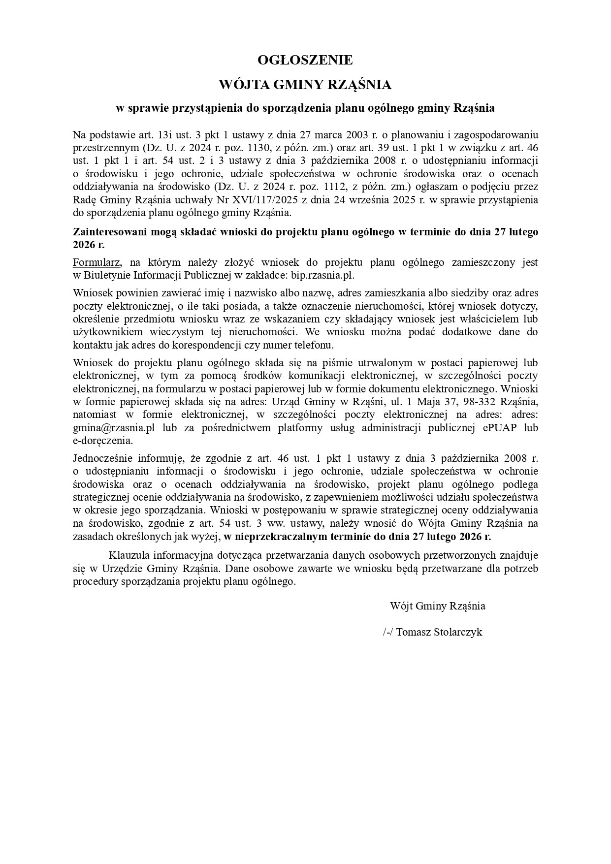 Ogłoszenie Wójta Gminy Rząśnia w sprawie przystąpienia do sporządzenia planu ogólnego gminy Rząśnia