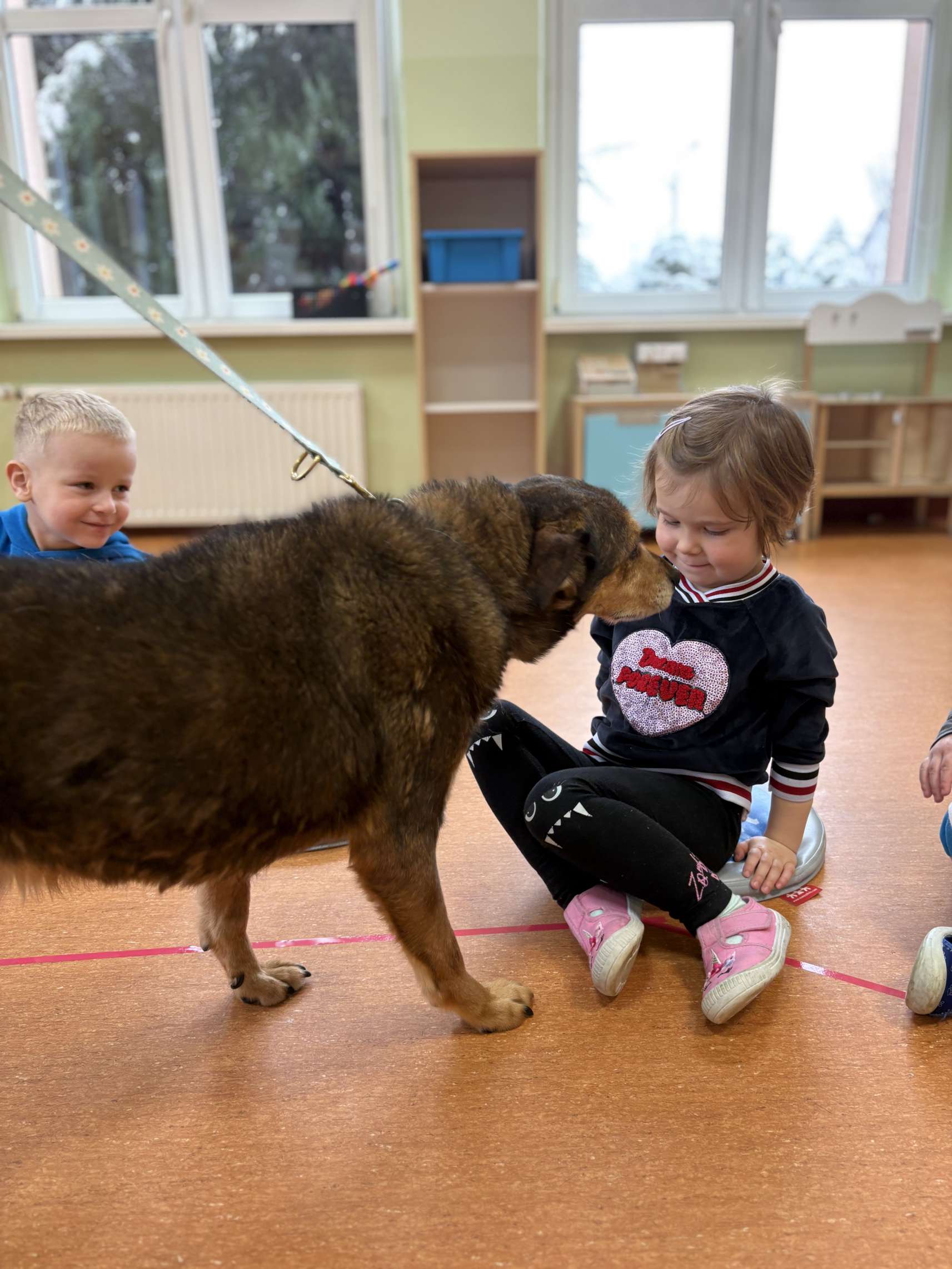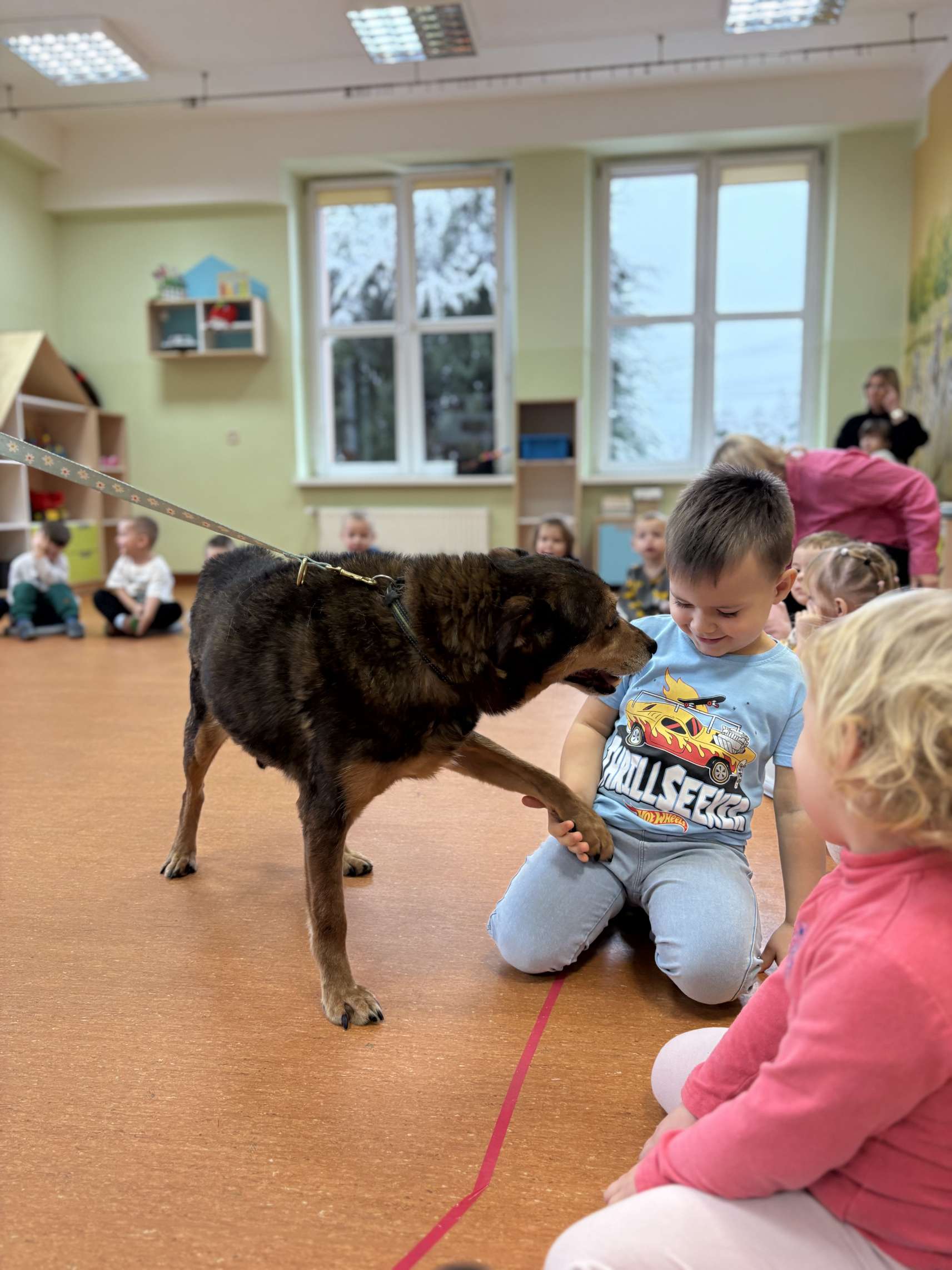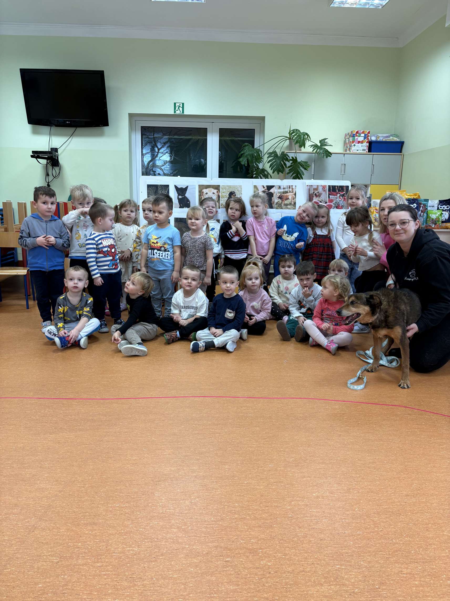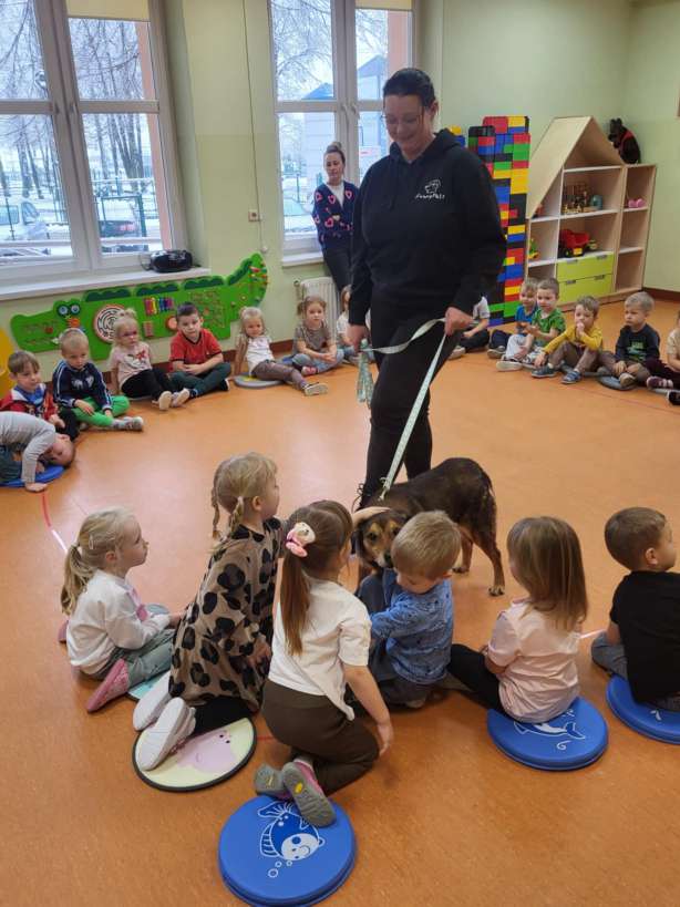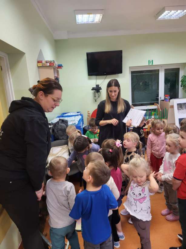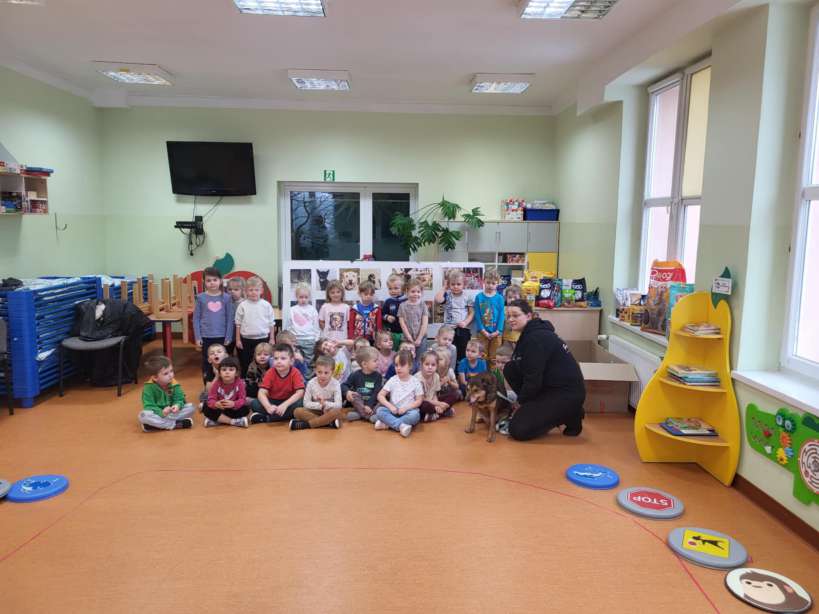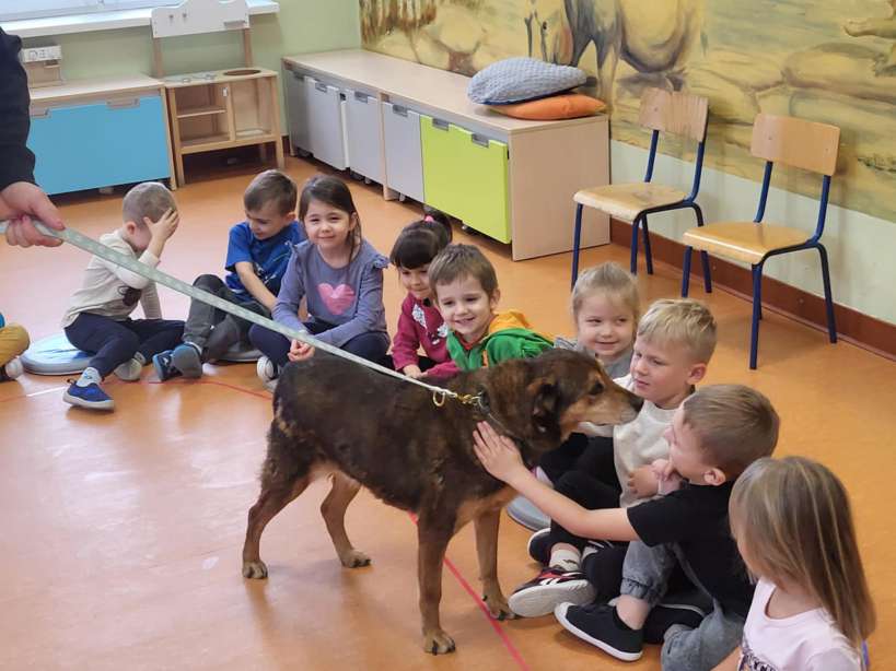 Dzieci dowiedziały się jak prawidłowo opiekować się zwierzętami, co to jest schronisko i jak trafiają do niego podopieczni. Wykonano wspólne pamiątkowe zdjęcie a na koniec przekazano przysmaki i karmę, którą dzieci przyniosły dla podopiecznych schroniska. Dzieciom bardzo podobało się spotkanie z czworonogiem, a pracownicy przedszkola już rozmawiali o możliwości kolejnych spotkań.