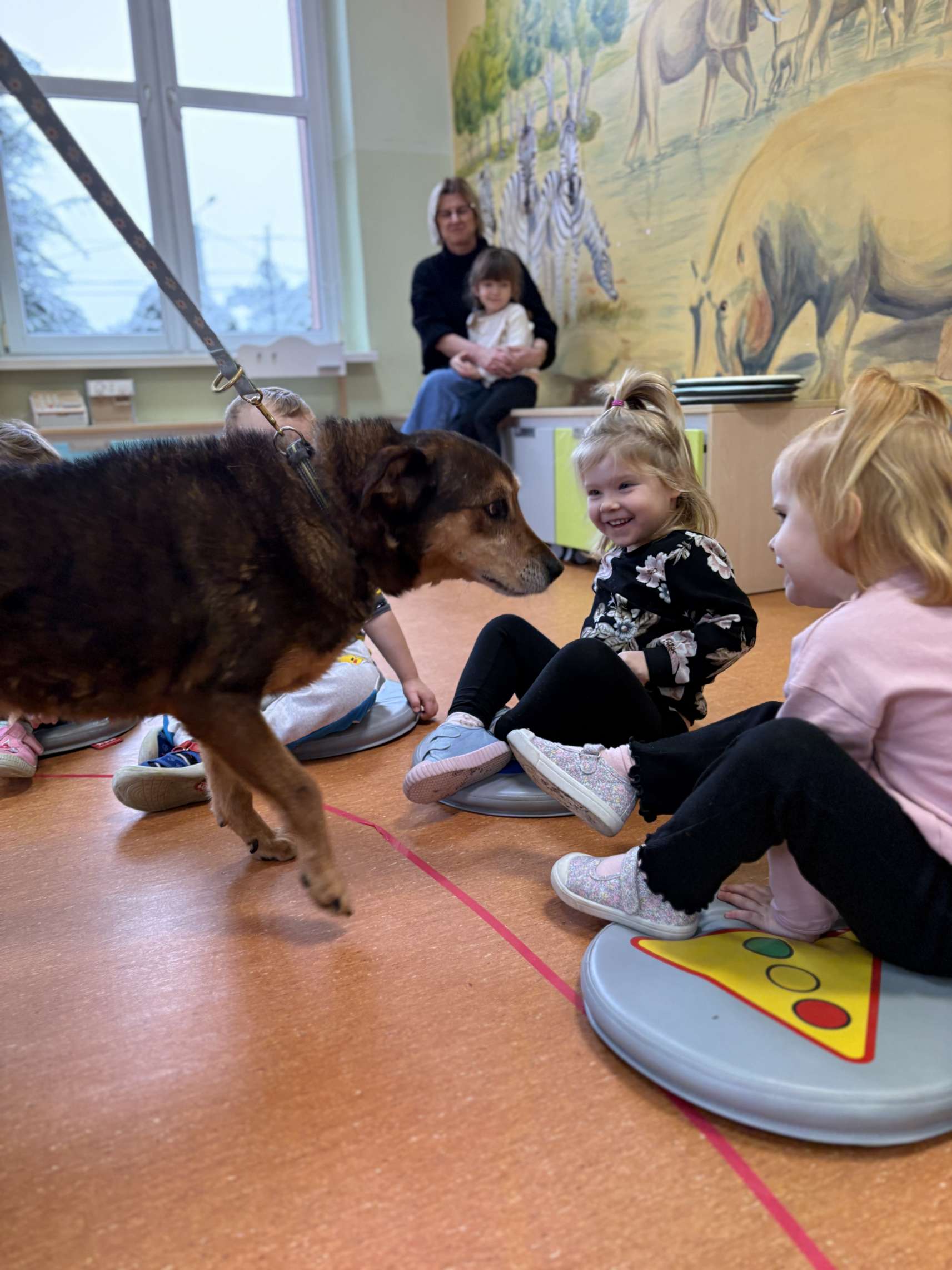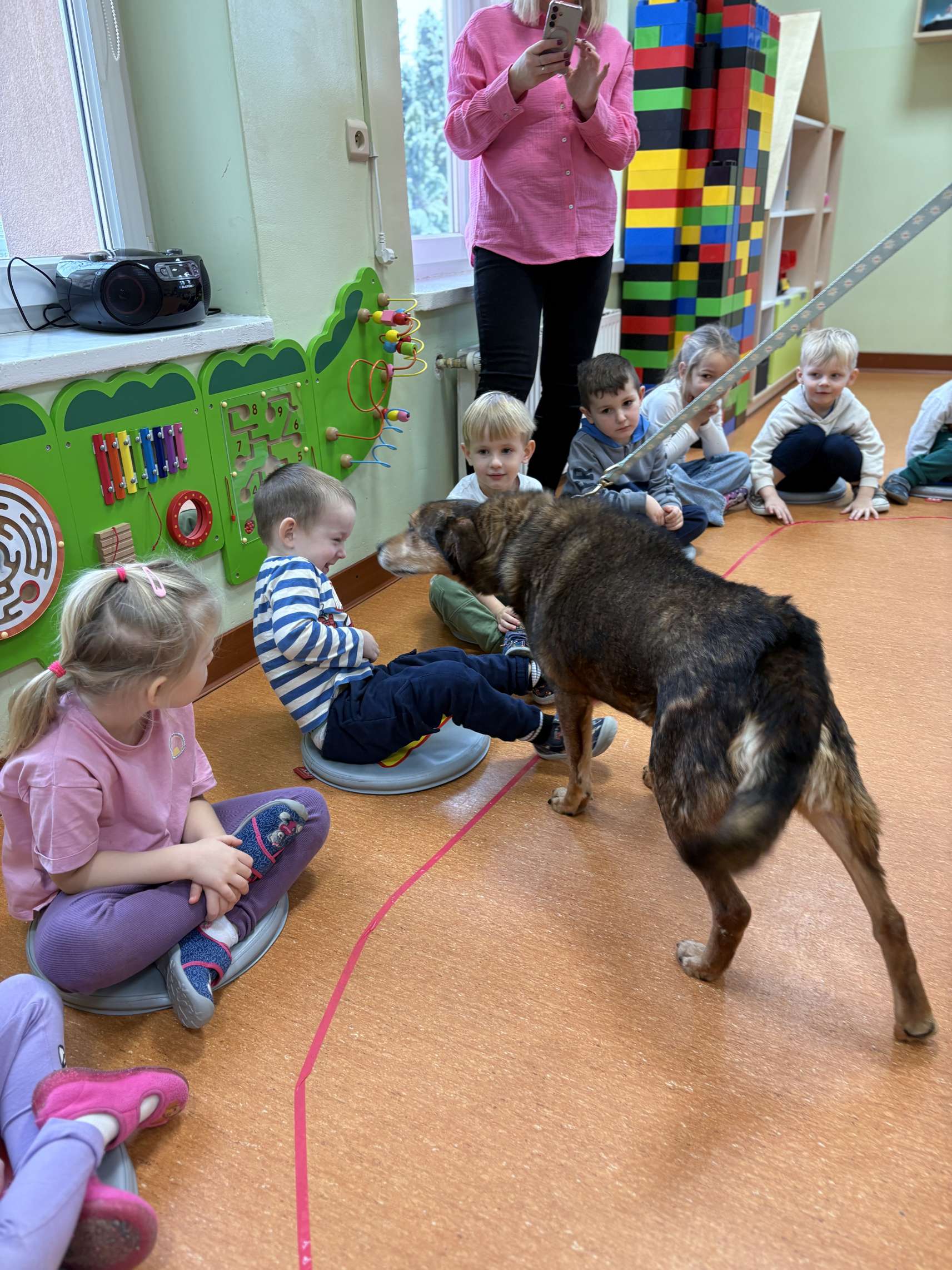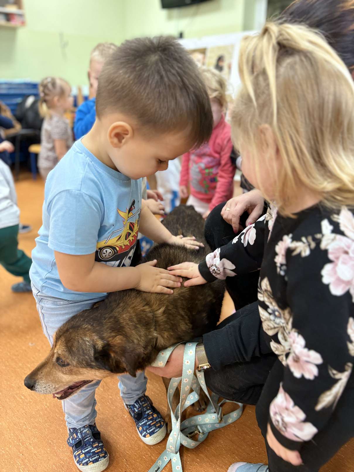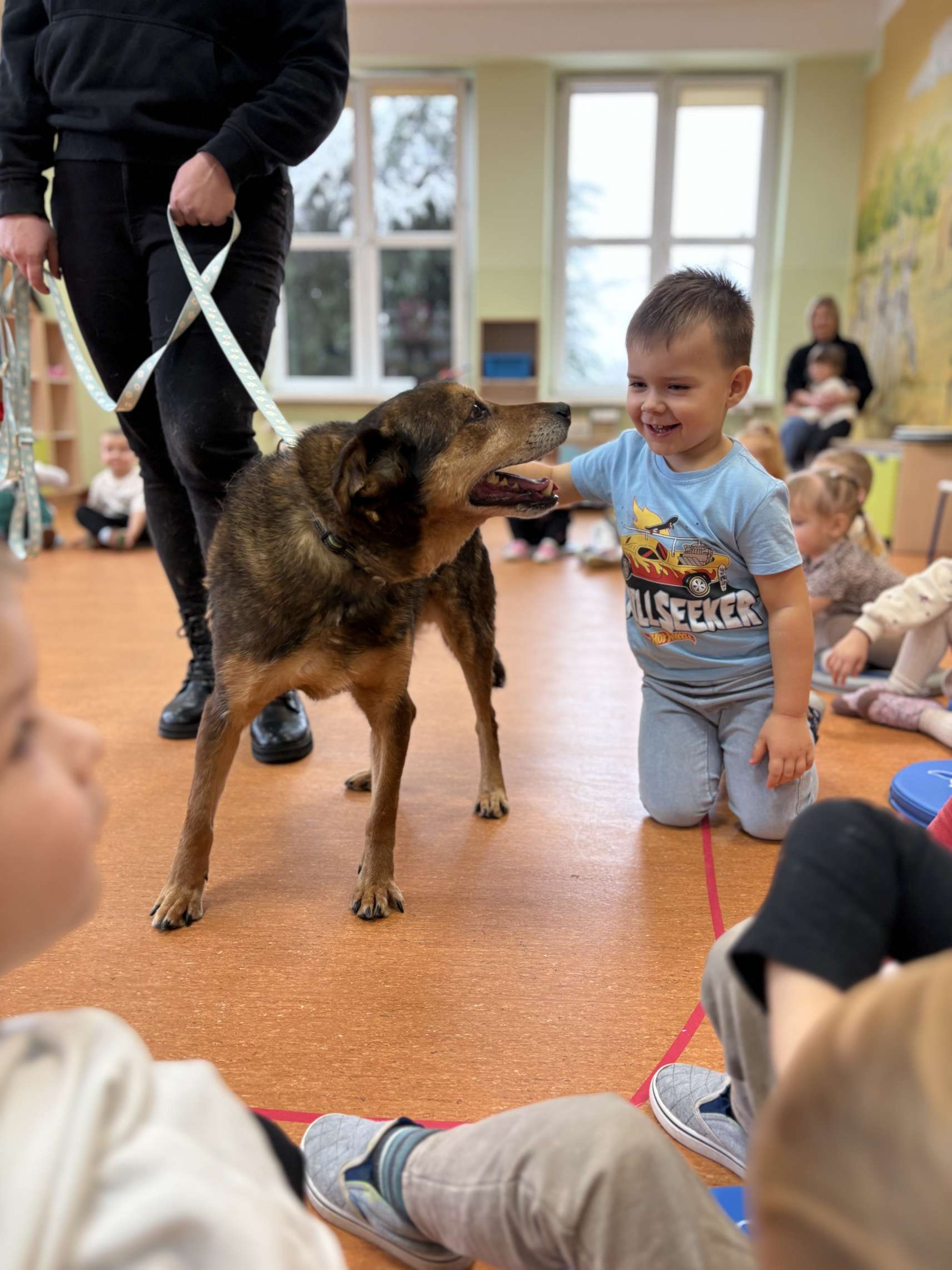 Dzieci dowiedziały się jak prawidłowo opiekować się zwierzętami, co to jest schronisko i jak trafiają do niego podopieczni. Wykonano wspólne pamiątkowe zdjęcie a na koniec przekazano przysmaki i karmę, którą dzieci przyniosły dla podopiecznych schroniska. Dzieciom bardzo podobało się spotkanie z czworonogiem, a pracownicy przedszkola już rozmawiali o możliwości kolejnych spotkań.