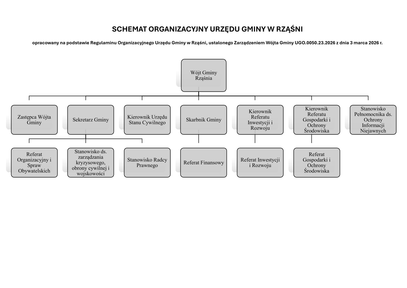 – Zarządzenie Wójta Gminy Rząśnia Nr UGO. 0050.23.2026 z dnia 3 marca 2026 roku w sprawie ustalenia Regulaminu Organizacyjnego Urzędu Gminy w Rząśni.