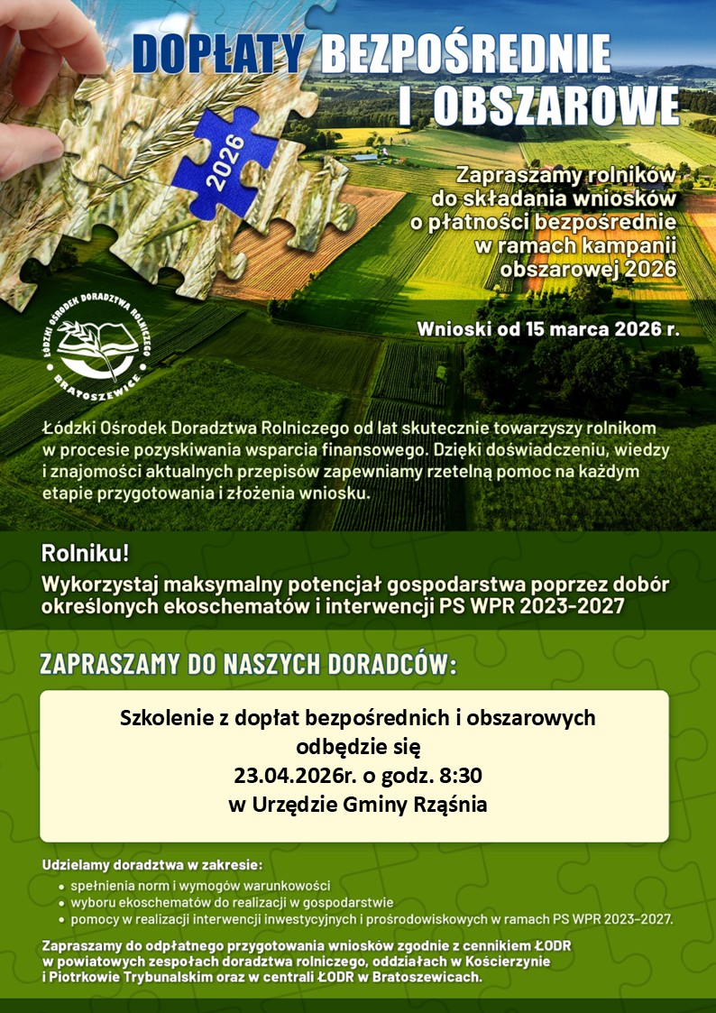 Łódzki Ośrodek Doradztwa Rolniczego Rolniczego z siedzibą w Bratoszewicach, Oddział w Kościerzynie, Powiatowy Zespół Doradztwa Rolniczego w Pajęcznie zaprasza na szkolenie z dopłat bezpośrednich i obszarowych, które odbędzie się w czwartek 23 kwietnia 2026 r. o godz. 8.30 w Urzędzie Gminy w Rząśni.