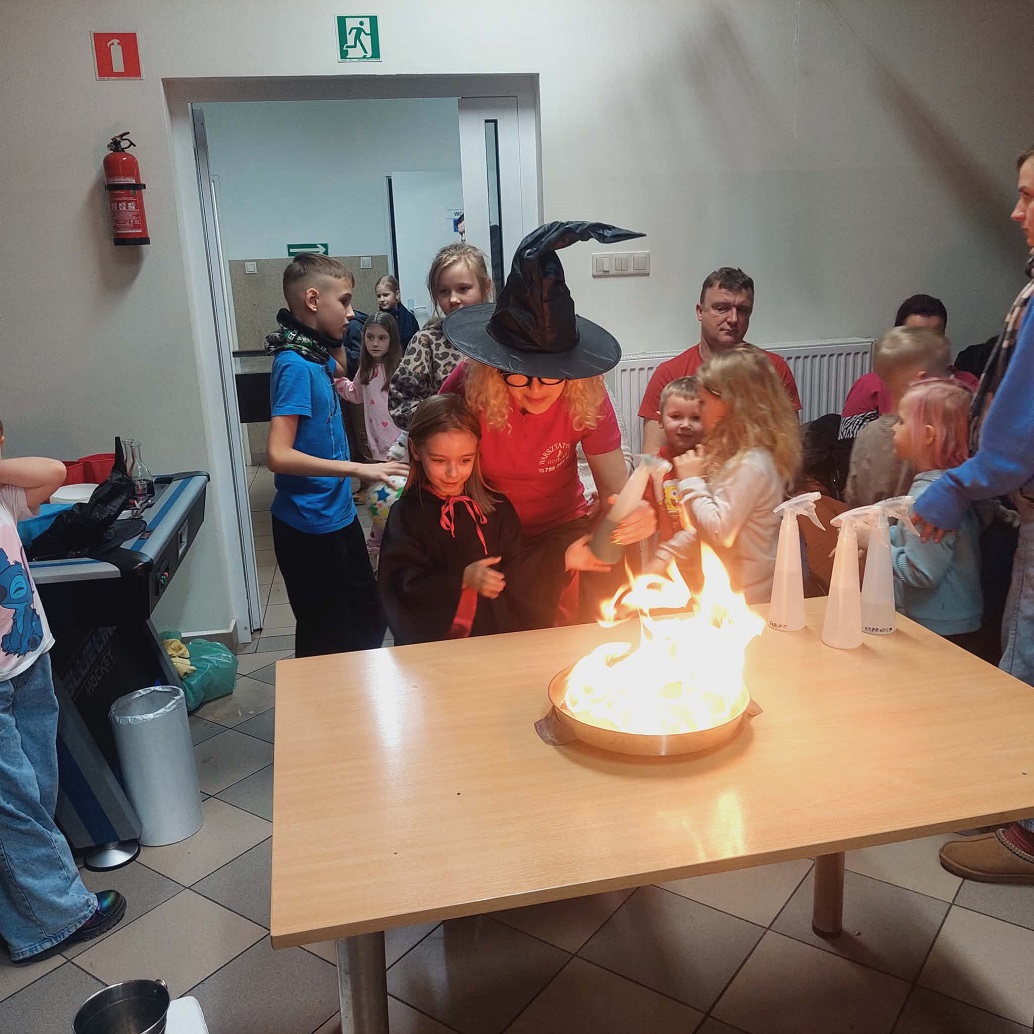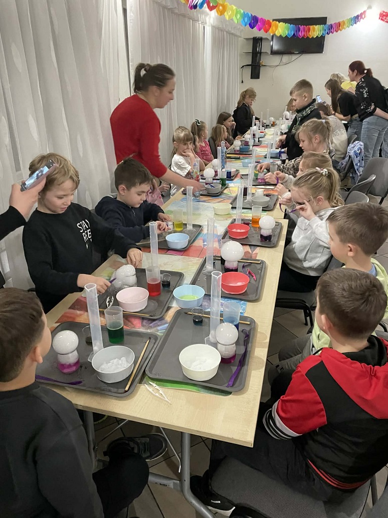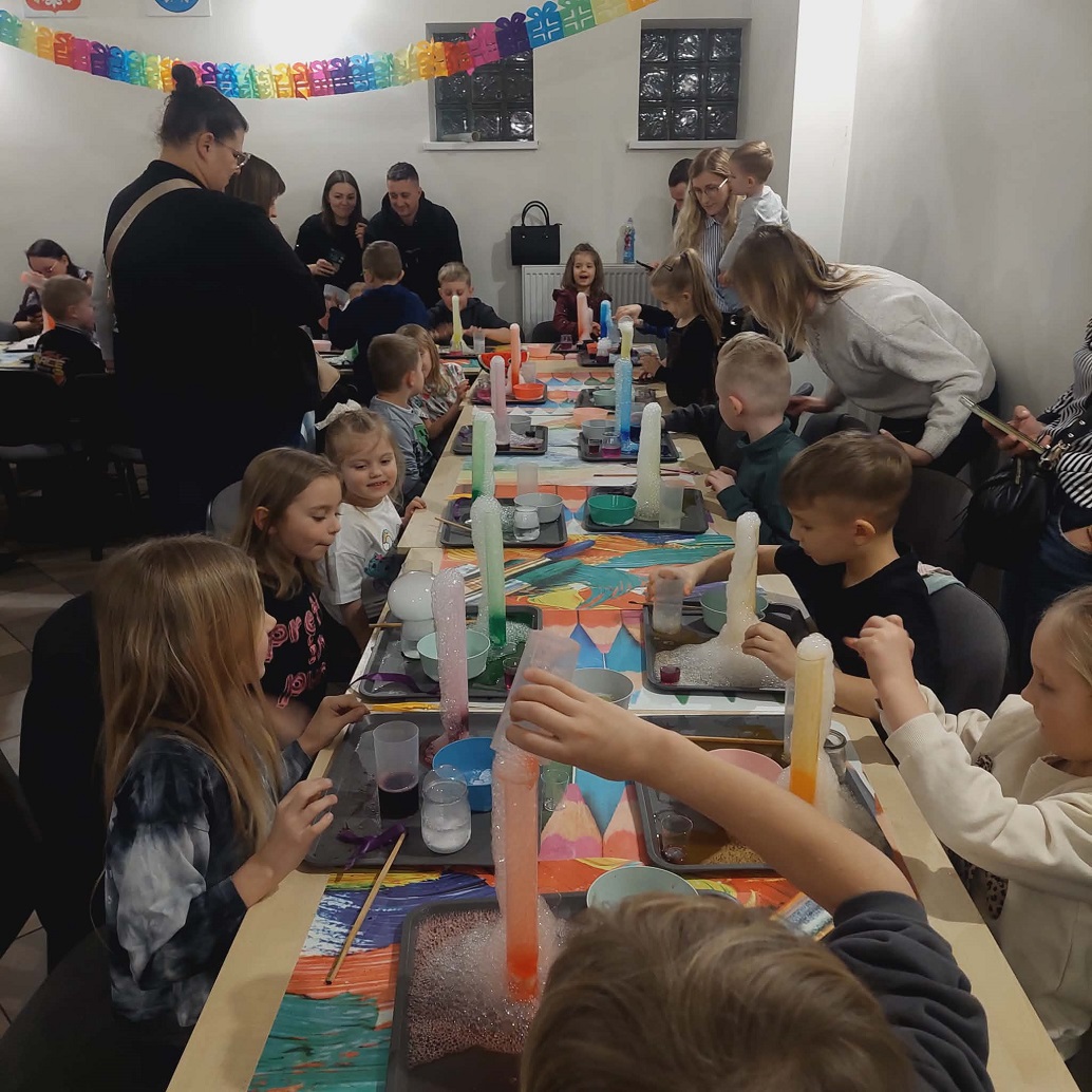 Dzieci samodzielnie tworzyły kryształowe kule, wulkany, bańki dymne i łapali swoje duszki., a nawet robili własne „slime”. Warsztaty były nie tylko świetną zabawą, ale uczyły bezpiecznego eksperymentowania i pomagały zrozumieć podstawowe prawa fizyki i chemii.