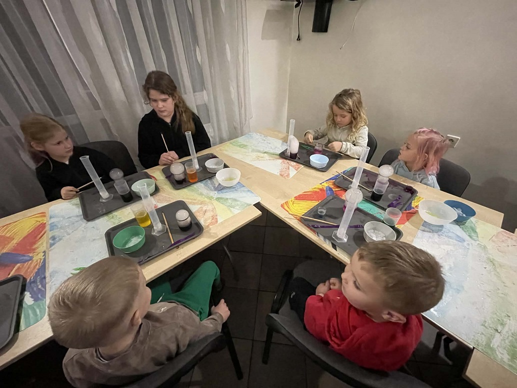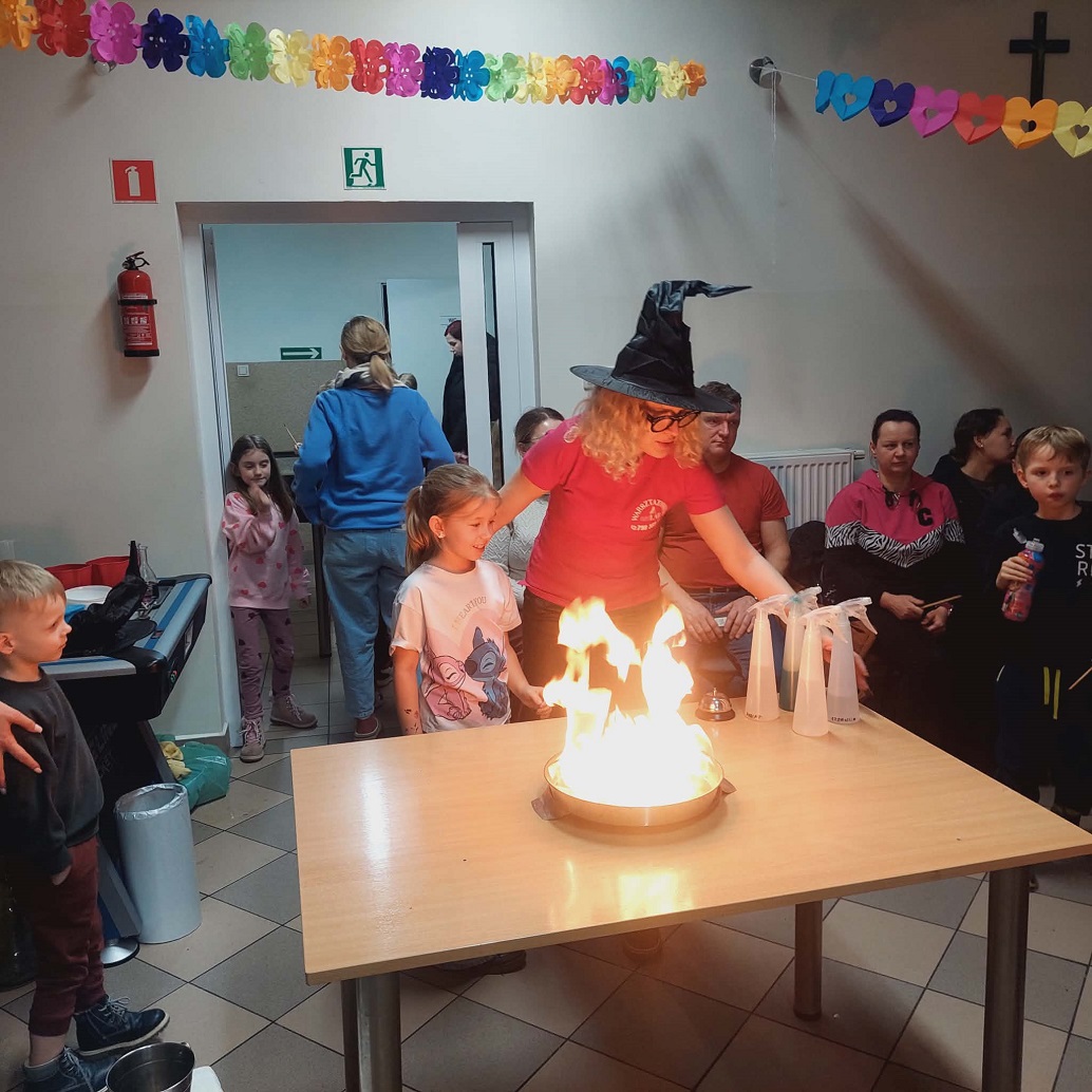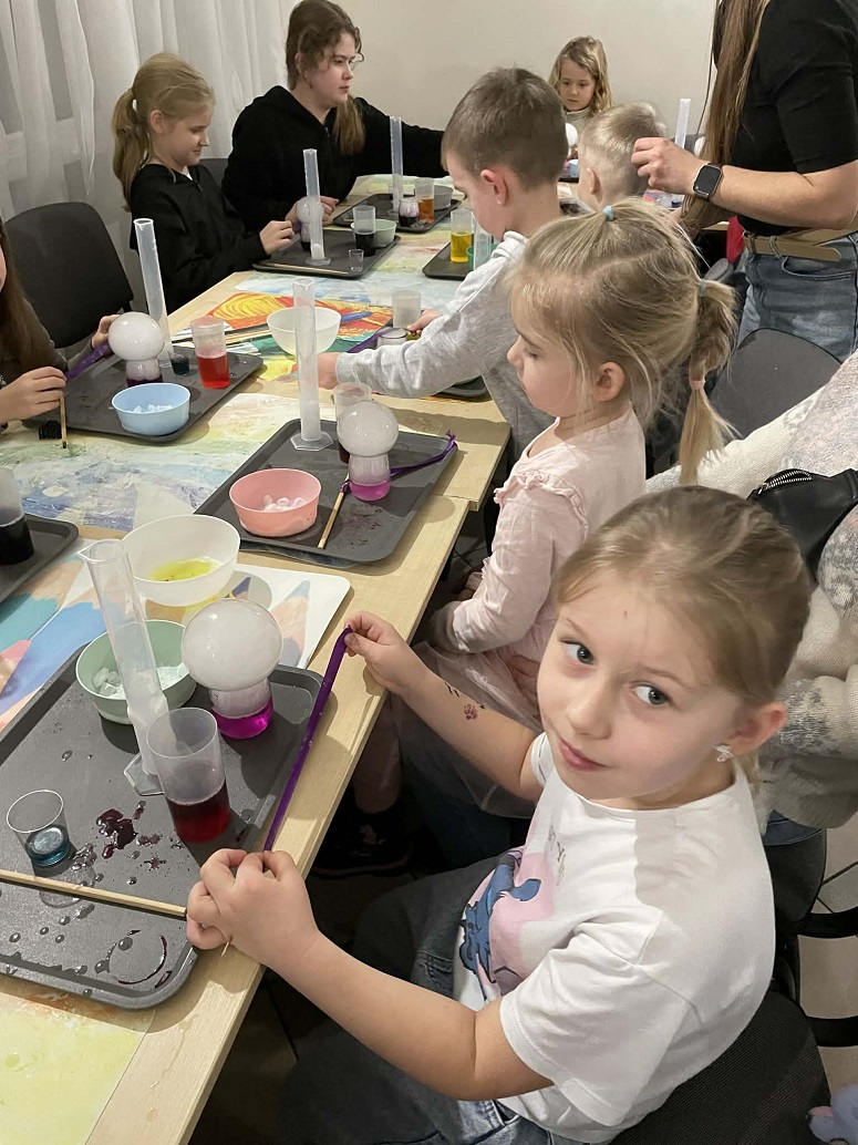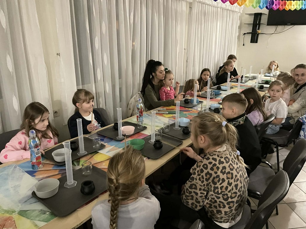 Dzieci samodzielnie tworzyły kryształowe kule, wulkany, bańki dymne i łapali swoje duszki., a nawet robili własne „slime”. Warsztaty były nie tylko świetną zabawą, ale uczyły bezpiecznego eksperymentowania i pomagały zrozumieć podstawowe prawa fizyki i chemii.