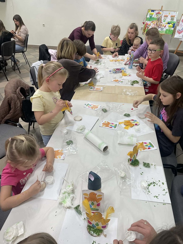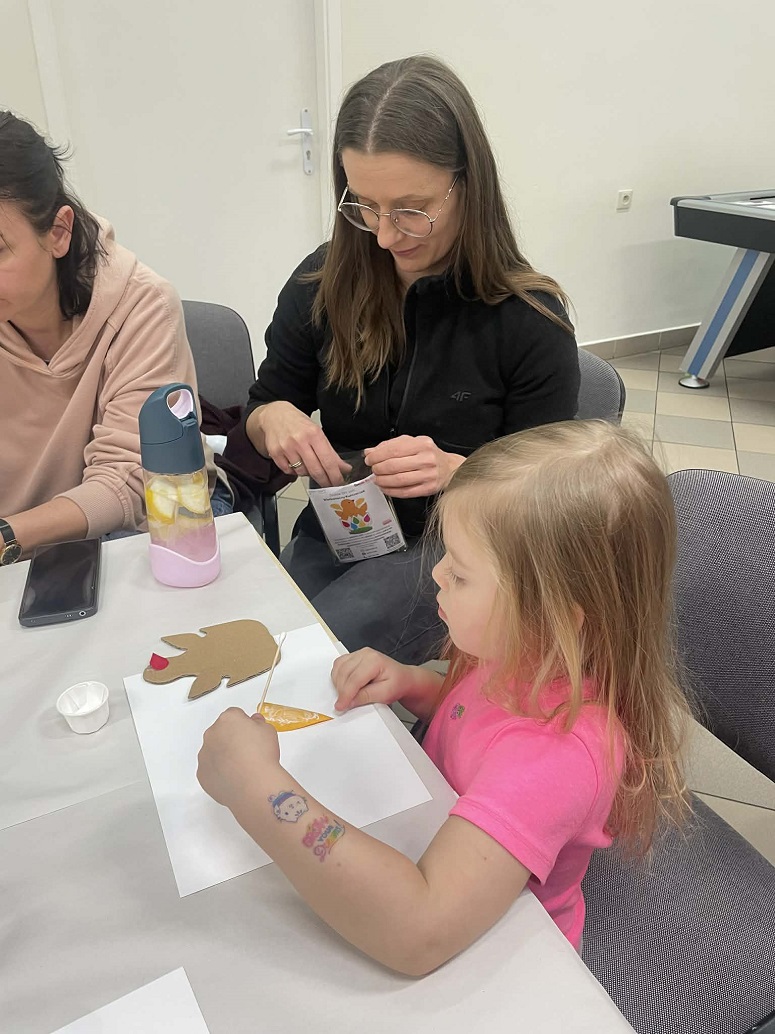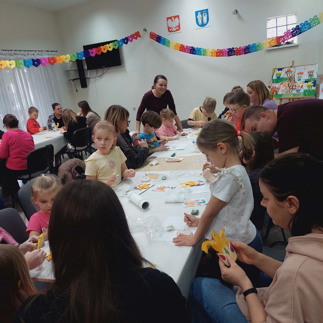 Uczestnicy mieli okazję własnoręcznie wykonać ozdobne figurki, które doskonale wpisują się w klimat Świąt Wielkanocnych. Podczas zajęć poznaliśmy właściwości drewna osikowego – lekkiego, miękkiego i przyjemnego w obróbce, dzięki czemu idealnie nadawało się do pracy dla początkujących. Najbardziej twórczym etapem było dekorowanie kurczaków, milusińscy ozdabiali je naturalnymi materiałami, takimi jak sznurek, piórka czy suszone rośliny, a także nadawać im indywidualny charakter. Każda praca była unikalna i odzwierciedlała styl oraz wyobraźnię twórcy.