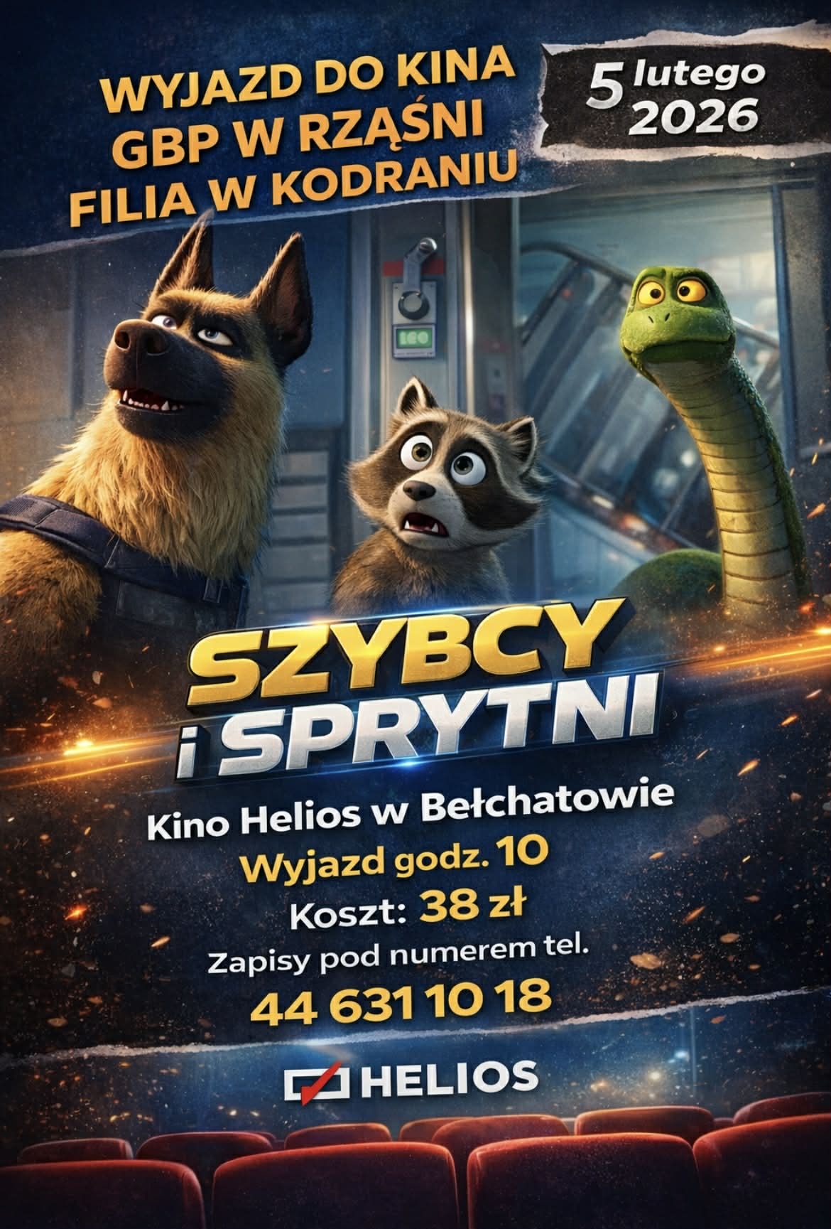 Gminna Biblioteka Publiczna w Rząśni, Filia w Kodraniu zaprasza 5 lutego 2026 r. o godz. 10.00 na wyjazd do kina „Helios” w Bełchatowie na film: „Szybcy i sprytni”.