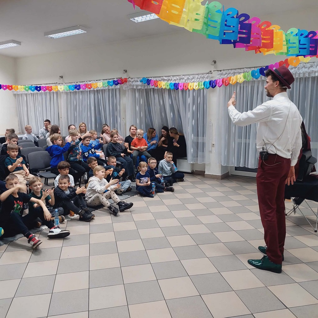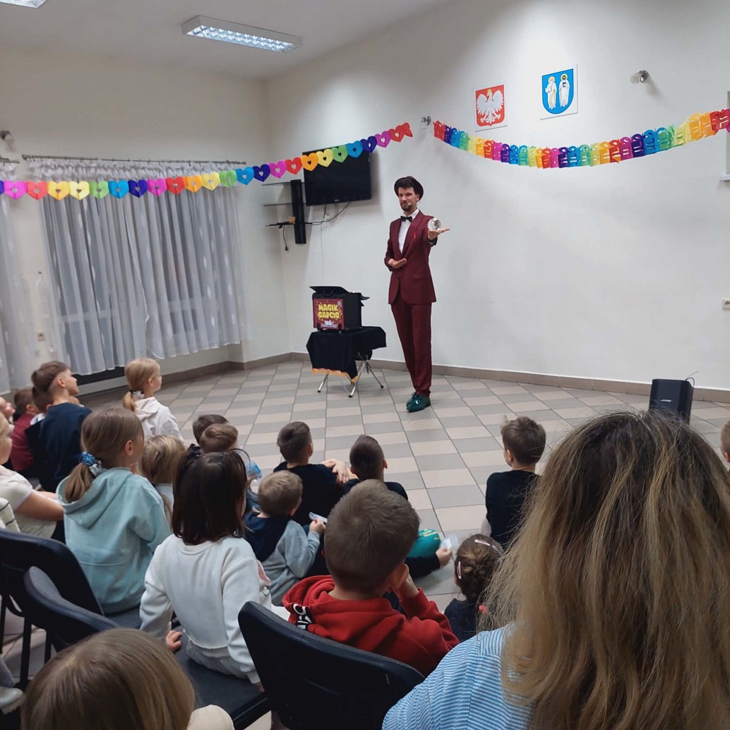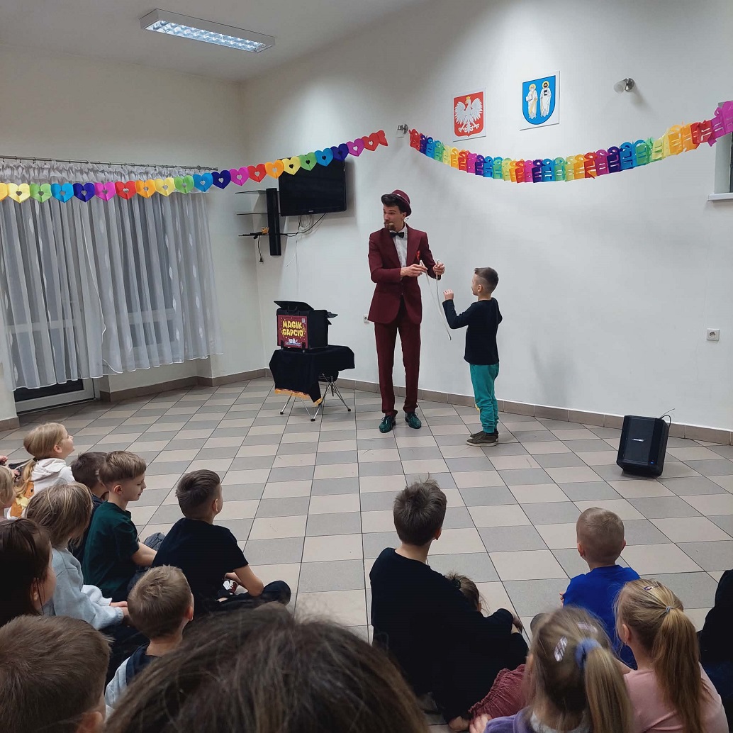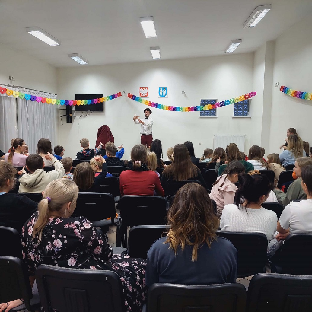 Uczestnicy mieli okazję nie tylko obserwować sztuczki z bliska, ale również aktywnie w nich uczestniczyć co wywołało wiele radości i spontanicznych reakcji. Magik Gapcio oczarował publiczność poczuciem humoru, energią oraz doskonałym kontaktem z widzami. Sala wypełniła się śmiechem, oklaskami i okrzykami zachwytu, a atmosfera była prawdziwie magiczna.