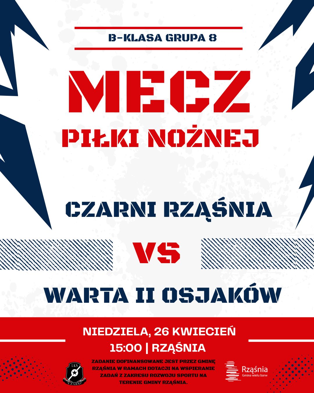Po przerwie na mecz wyjazdowy drużyna Czarnych wraca na stadion w Rząśni. W 15 kolejce Grupy 8 łódzkiej B-klasy naszej drużynie przyjdzie zmierzyć się z Warta II Osjaków. Pierwszy gwizdek wybrzmi o 15:00 w niedzielę 26 kwietnia. Przeciwnik zajmuje obecnie 7 miejsce w tabeli z 19 punktami, tracąc 12 do zajmujących drugą pozycje Czarnych. W poprzedniej rundzie w meczu rozgrywanym przy sztucznym oświetleniu w Osjakowie Czarni zwyciężyli 4:3. Do spotkanie obie drużyny przystąpią w odmiennych nastrojach – Czarni zwyciężyli 3:2, natomiast Warta II przegrała 3:0.
