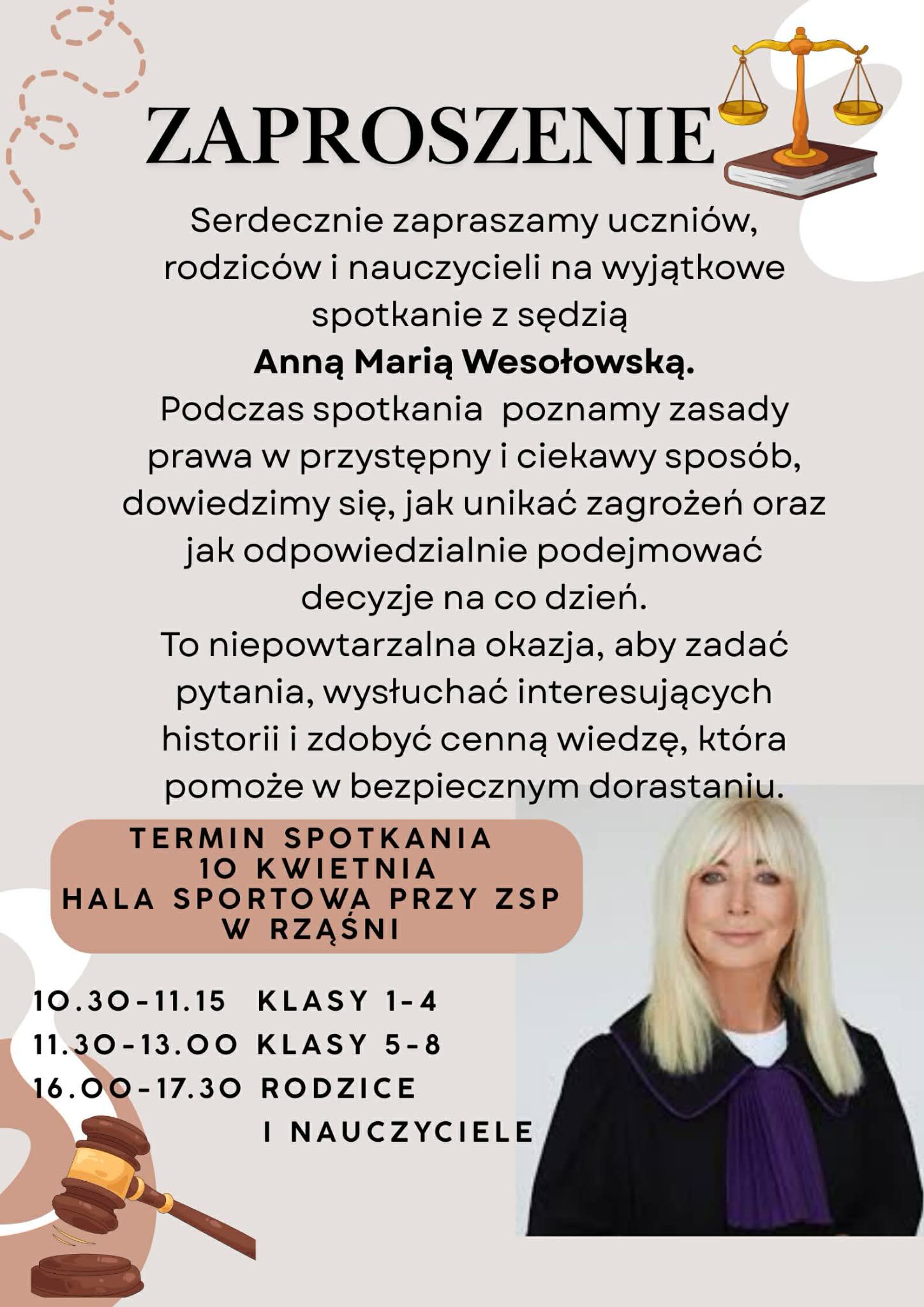 Dnia 10 kwietnia 2026 r. na hali sportowej przy Zespole Szkolno – Przedszkolnym w Rząśni odbędzie się spotkanie z sędzią Anną Marią Wesołowską, znaną z wieloletniej pracy w wymiarze sprawiedliwości oraz działalności edukacyjnej i społecznej.