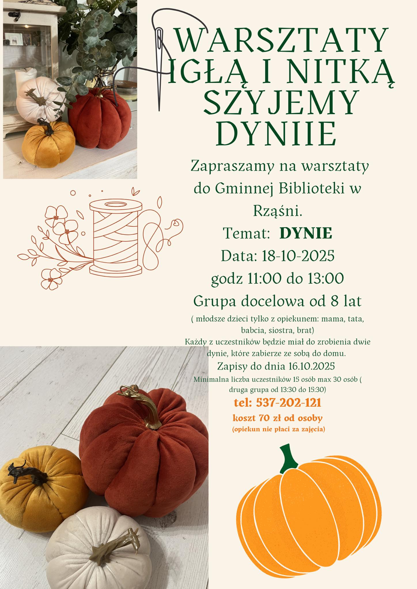 Zapraszamy do Gminnej Biblioteki Publicznej w Rząśni na warsztaty „Igłą i nitką, szyjemy dynie”, które odbędą się 18 października 2025 r. od godz. 11.00 do 13.00. Grupa docelowa zajęć to dzieci od 8 lat (młodsze dzieci tylko z opiekunem: mama, tata, babcia, siostra, brat). Każdy z uczestników będzie miał do zrobienia dwie dynie, które zabierze ze sobą do domu.